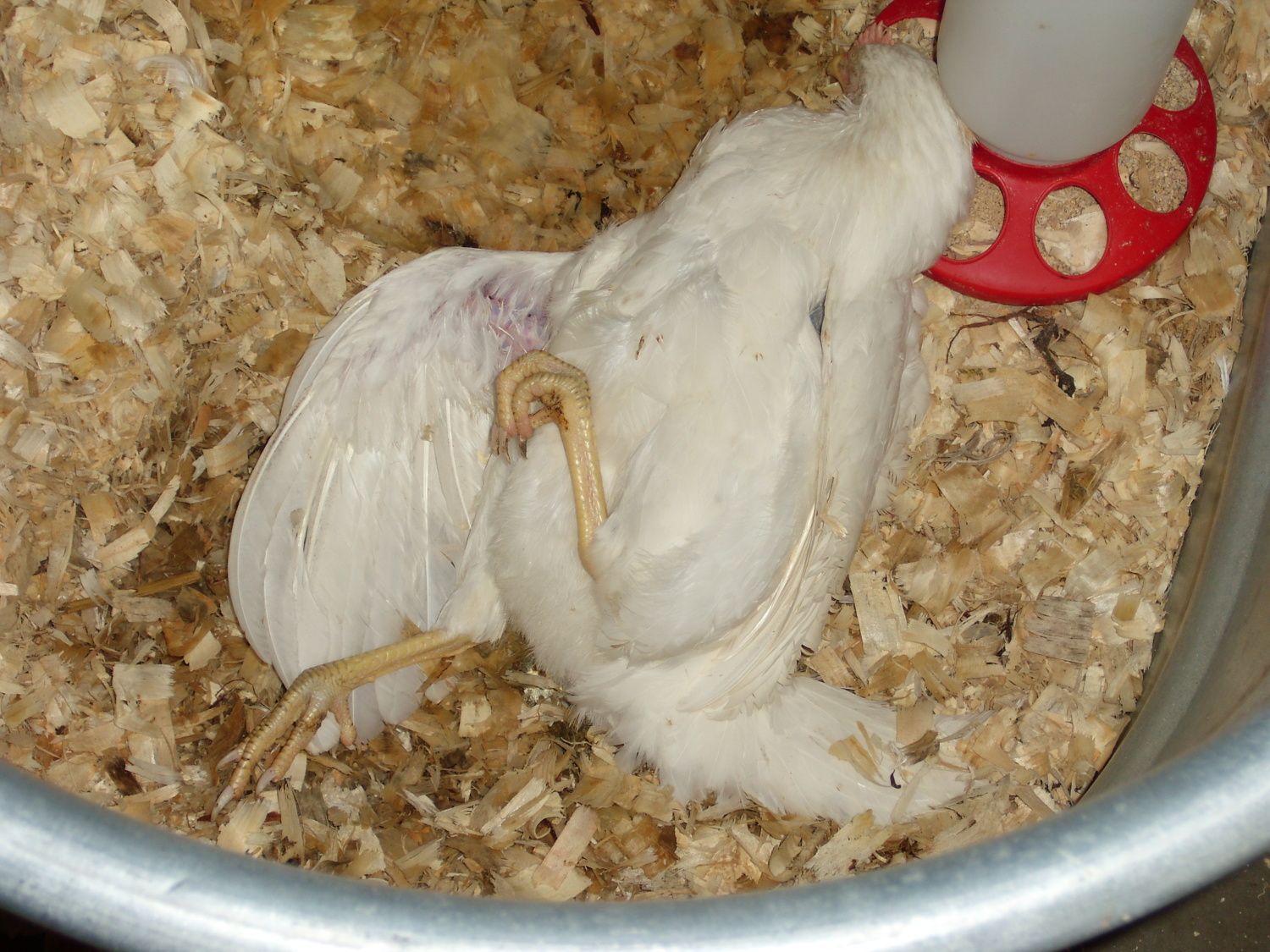The white leghorn seems to be sitting up although its neck is still pushed off to the side. The black sex link has gotten worse. Its neck is now twisted so much it is virtually upside down.