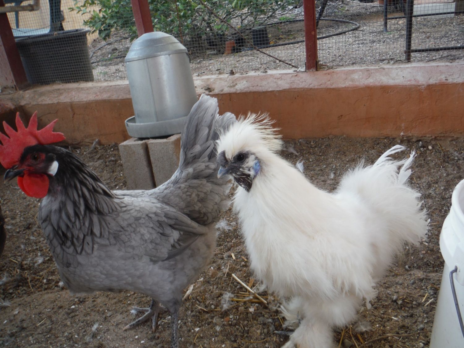 A little while back I hatched a couple white silkie x blue andalusians. They are now about a month and a half old. They all have black skin, five toes, and tiny little crests. However, on two of them, I noticed orange feathers coming in. There aren't very many of them, just one or two here on the neck. Since neither their of their parents have orange feathers, I was wondering what may have caused this. Here are some pictures of the chicks and their parents: