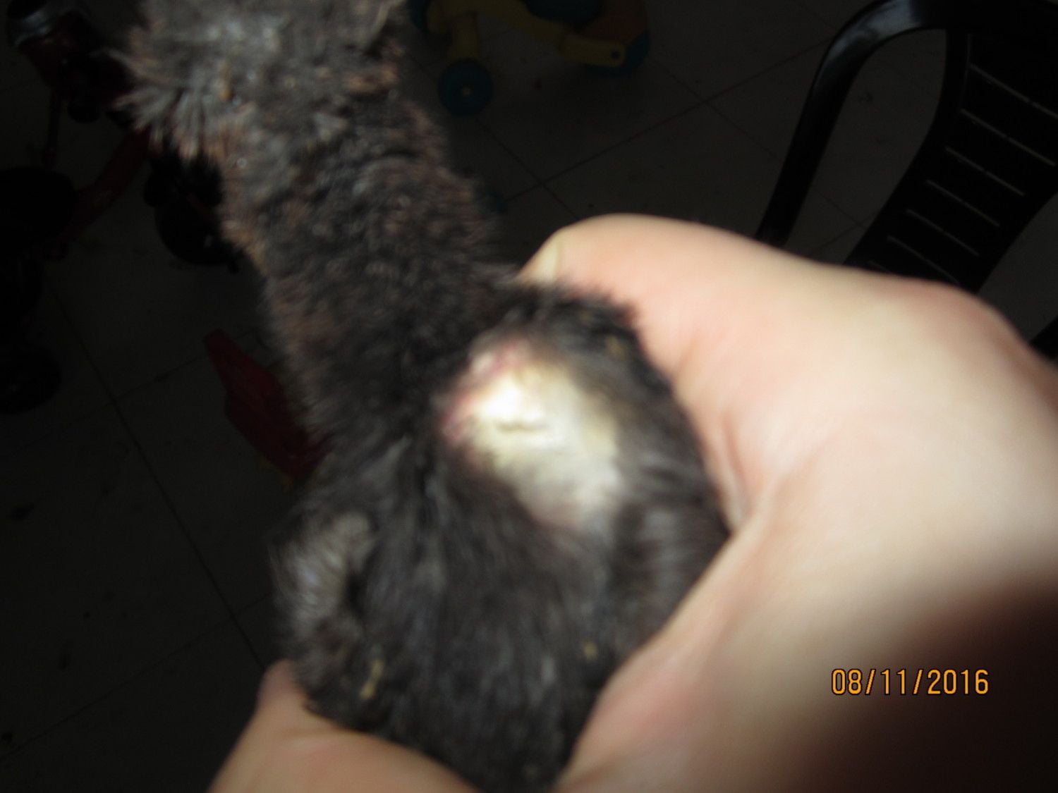 Exactly what I'm thinking but with chickens with non-standard plumage it is often impossible to tell which end of the bird one is looking at. If the place is in fact on the bird's back and not on its breast my advice is to put the poor thing down. I enjoy breeding and raising chickens but I don't particularly like playing Doctors Jekyll or Frankenstein with my feathered friends.The picture is out of focus. Would it ne possible to get another one? I can't tell if it is one the back or front, and it looks a little like how ingrown feathers look, but again is out of focus. If it is a full crop, that is on the chest just under the neck. It fills up gradually with food and water. Chicks this age only need grit if they are eating something other than chick feed, such as grass or grains. They can get an impacted crop from eating their bedding.