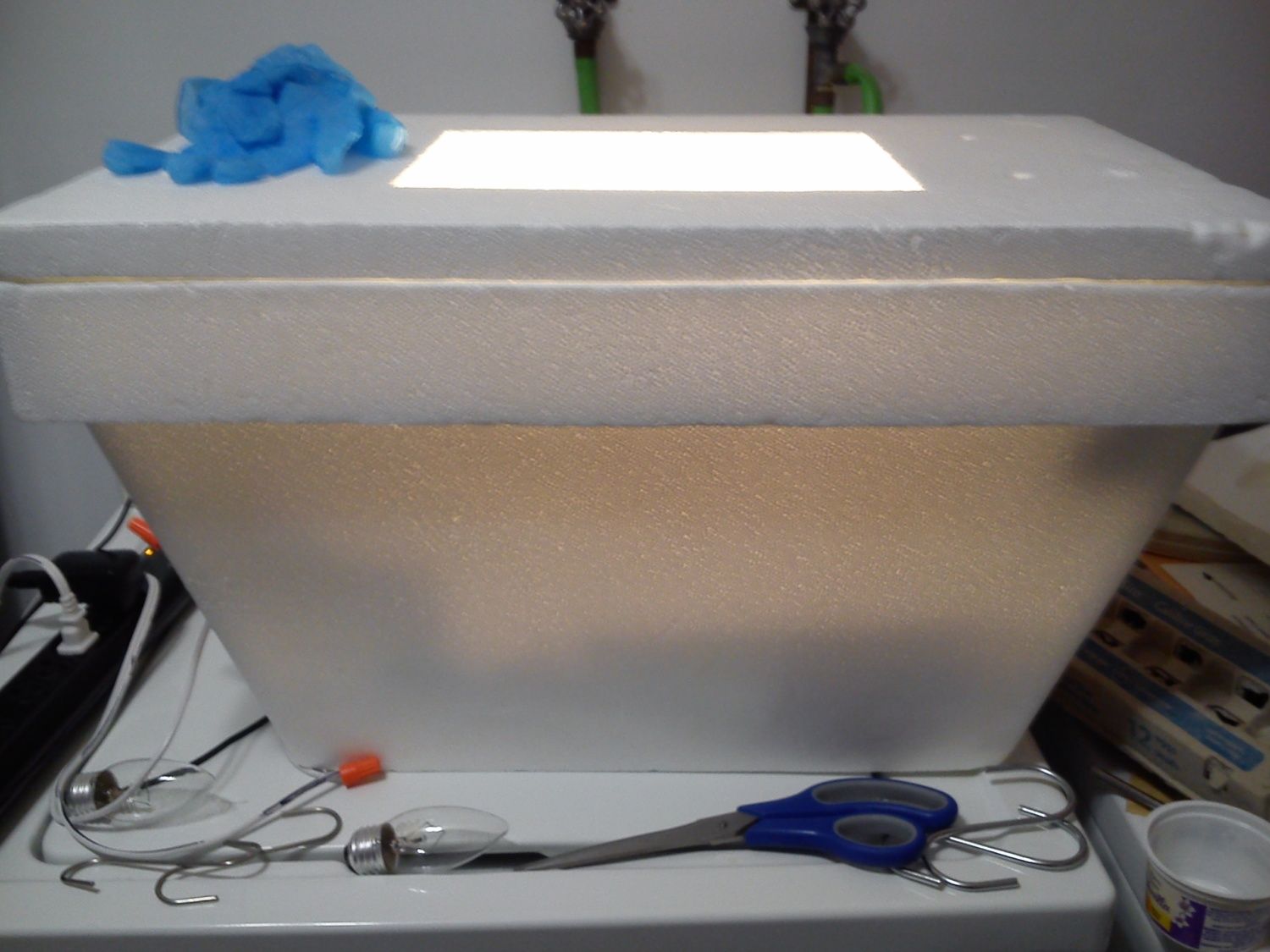 My incubator is a basic Styrofoam cooler. Unfortunately it's too small for a turner if you like using turners. It uses a wafer thermostat because that's all I could get at that time without ordering one in. Time was a factor because the eggs were 2.5 weeks old when I started building the incubator. I wired it using 2 pigtail sockets which run 2- 25 watt bulbs. I bought a 6 inch $7 fan from Walmart for circulation and voila, that's the main components. The fan is a bit of overkill, but I wanted something quick to use at the time. I'd never wired before and I felt a bit intimidated about sourcing and wiring a computer fan. I believe I may have a cool spot under the fan (I didn't use the area under the fan last year) so that's something I need to determine and fix if needed. Pics are worth a thousand words so here's pics...