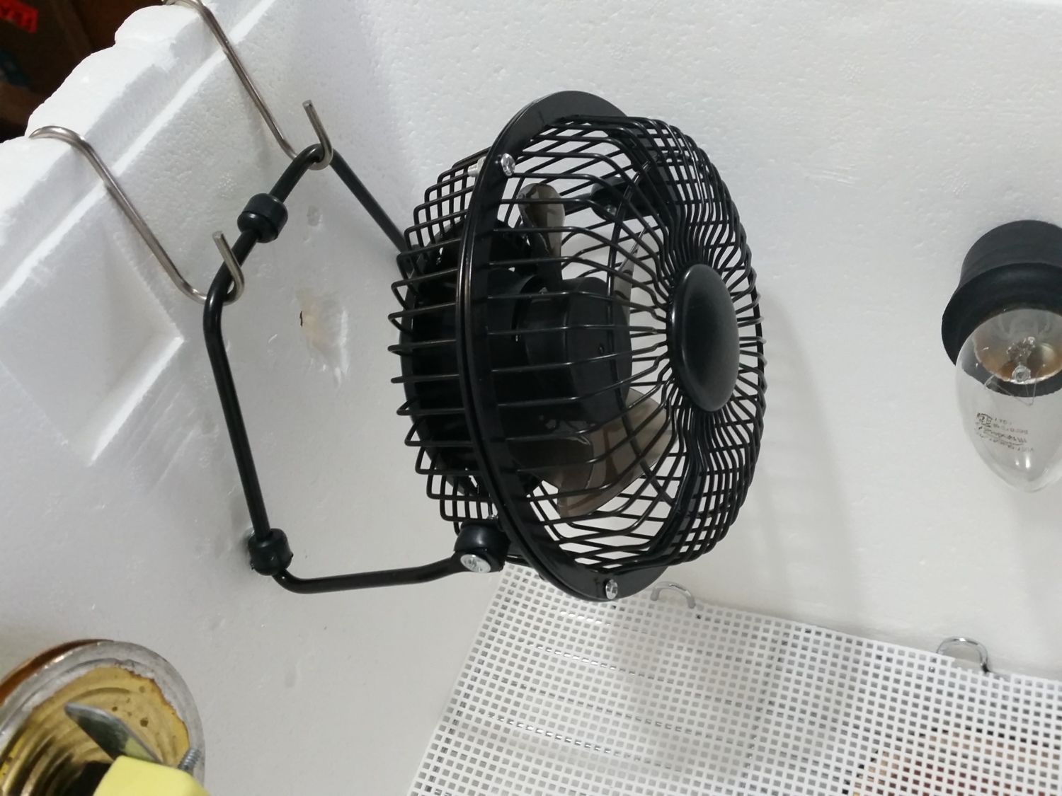 The above pic shows all the equipment I put in my Sterilite incubator. The double bulb adaptor and the extra four bulbs were not needed for my Styrofoam incubator. A digital thermostat with a sensor would be a nice improvement and something I plan to do in the future. I've noticed on here that some fans blow upwards and away from the eggs. Perhaps this would solve any cool spots under my fan? I have a rather large hole behind my fan that allows cold air to be brought in. That also may be my culprit.