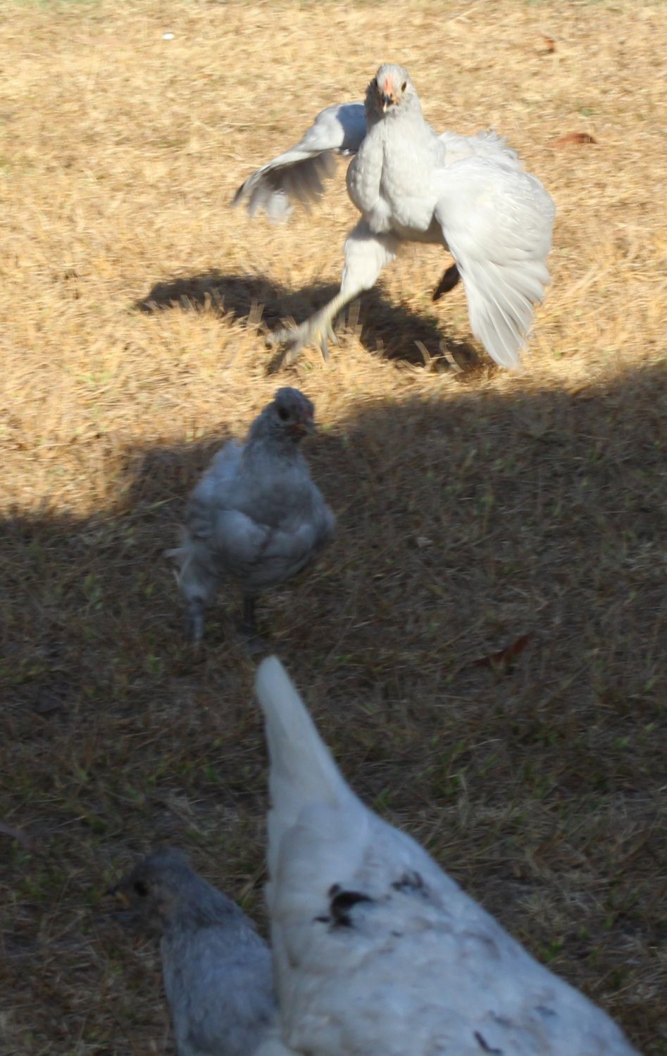 A group pic showing all my hens. Most of the chicks are happy to explore quite far from mum, but there is one precious little princess that is glued to Snowy's wing in nearly all the pics.