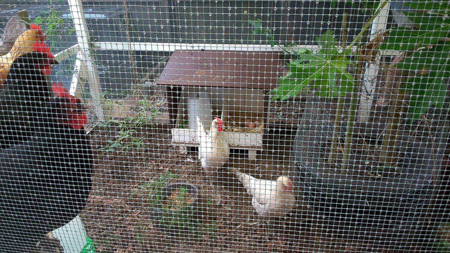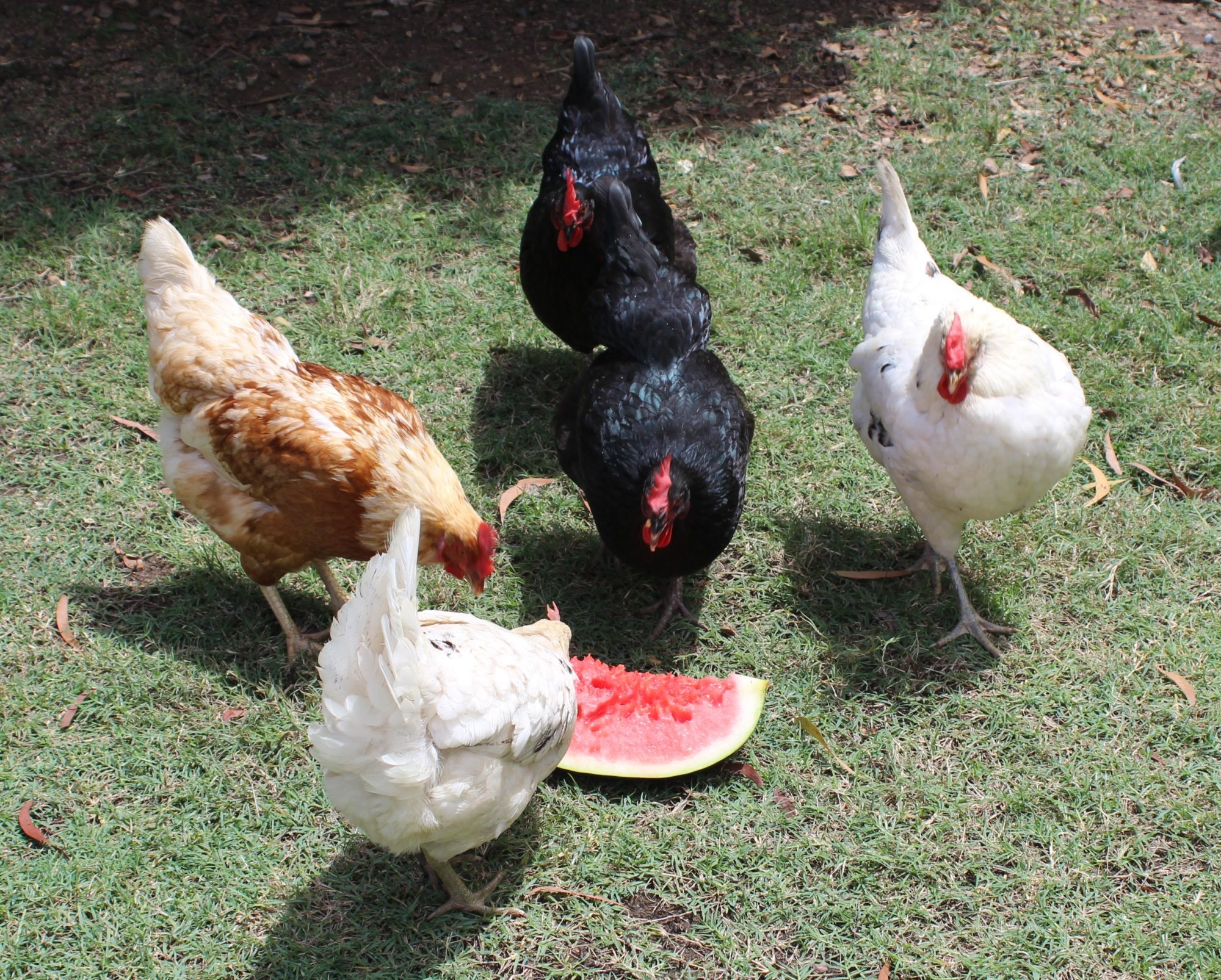 Stampy (ISA Brown), Snowy and Hedwig (Leghorn crosses) and Steve and Hagrid (Austrolorps)