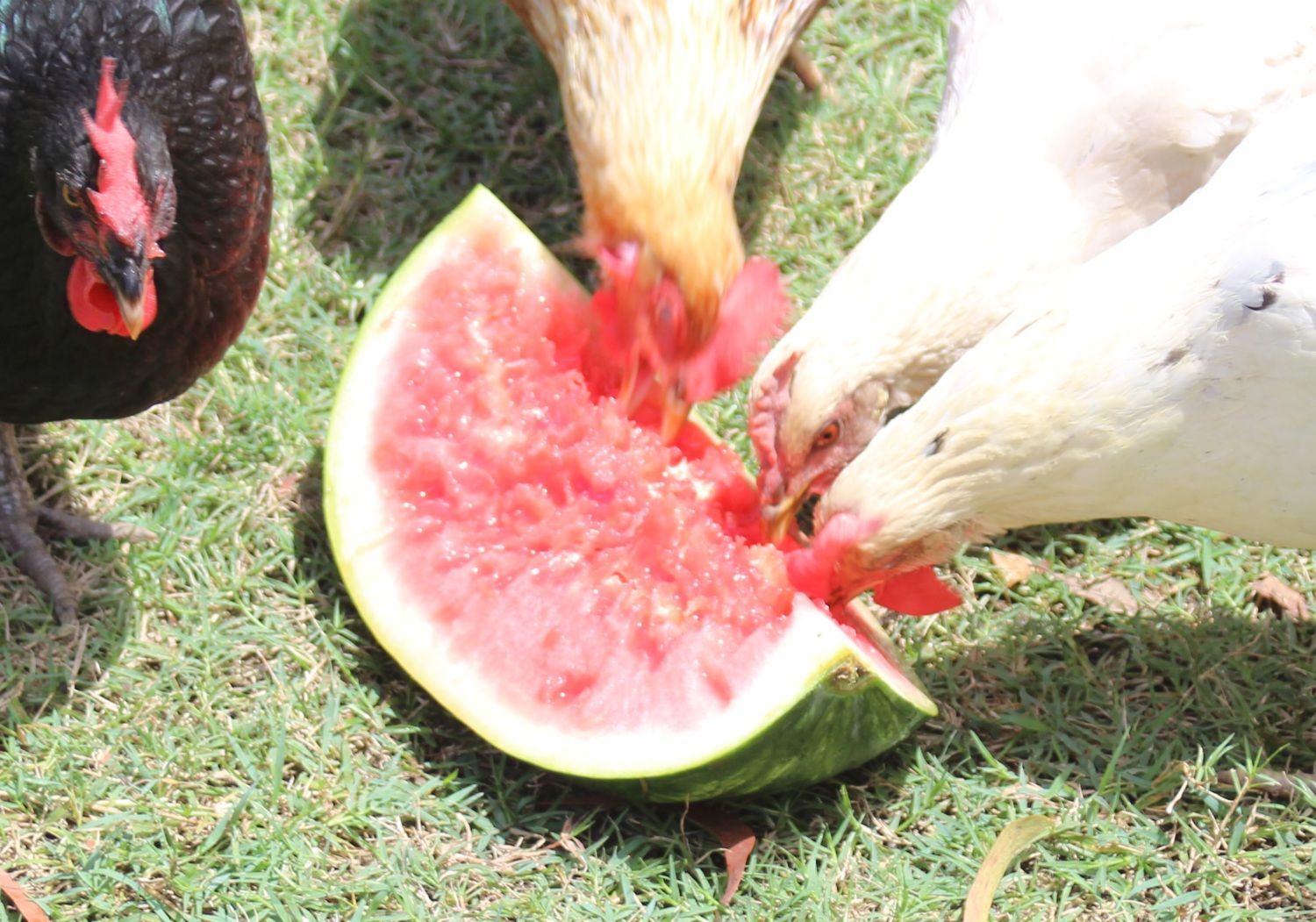 Hedwig patrolling the perimeter to make sure that none of the pesky young ones Snowy raised get stuck into the watermelon before the big girls have stuffed themselves. Snowy is broody again and was kindly ripped off the nest by my daughter so that she could share the watermelon. No fertile eggs for her this time!