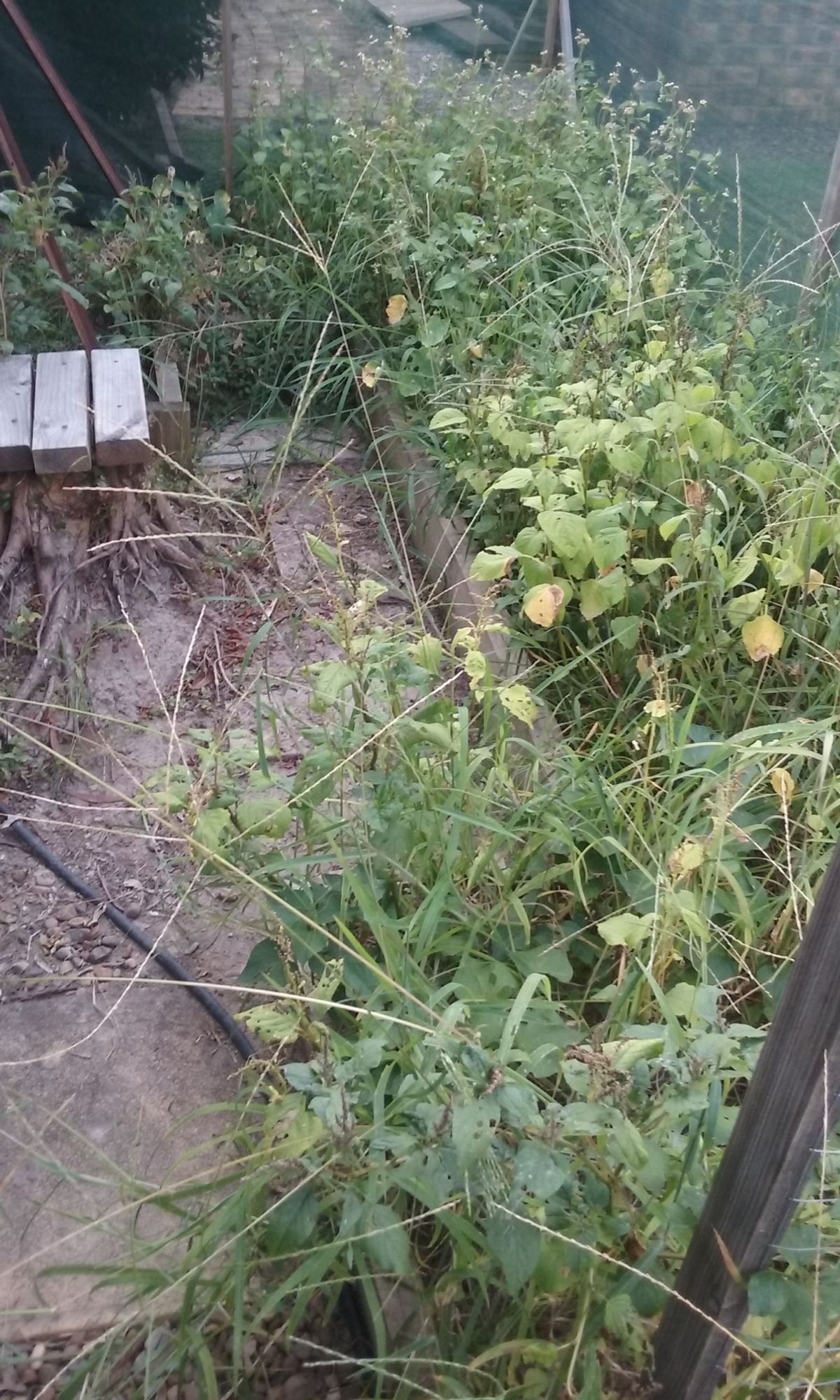 After clearing out the wilderness I found a self-seeded tomato plant with its first flower, some surviving chocolate mint, a few nasturtiums that I gave to the chickens as its too hot for them now and the sweet potatoes I planted a few months ago.