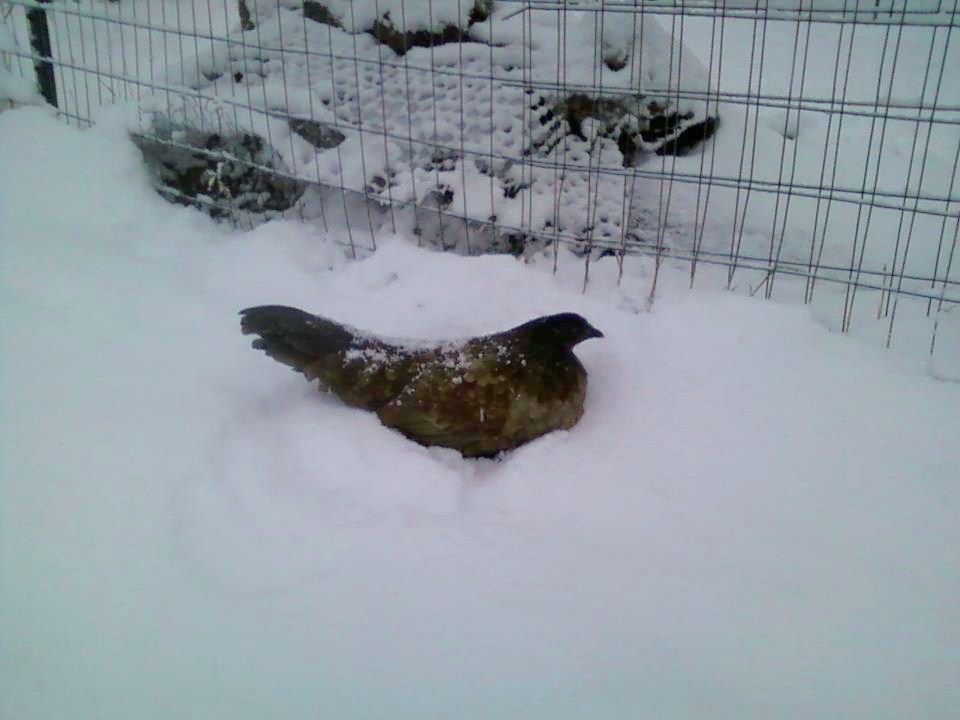 Also, we've been getting lots of snow lately and the crazy sumatras all decided to fly out of their coop when I opened the door. This is what most of them ended up like