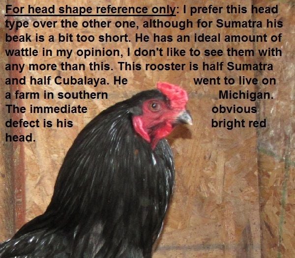 When some were going on about hen #2 in the picture needing a shorter beak and bigger head, I stopped and thought she would look more like a cornish than a sumatra. That's my opinion, but I admit when one says a big head and short beak I always think of a cornish. When I think of big heads, I tend to think of cornish, shamoos, brahams and those types of birds with a big head but not a sumatra. So I would like to know where NYRED and any others who have the opinion that a big head (I'm not talking broad, as I feel they should have a broad head) is needed on a sumatra to explain why. I will not tell you that your opinions are wrong, but I am wondering if I have missed somethings or maybe its a case of I took the use of big to mean the whole head size when it was meant more in the way of width/ broadness of the head.