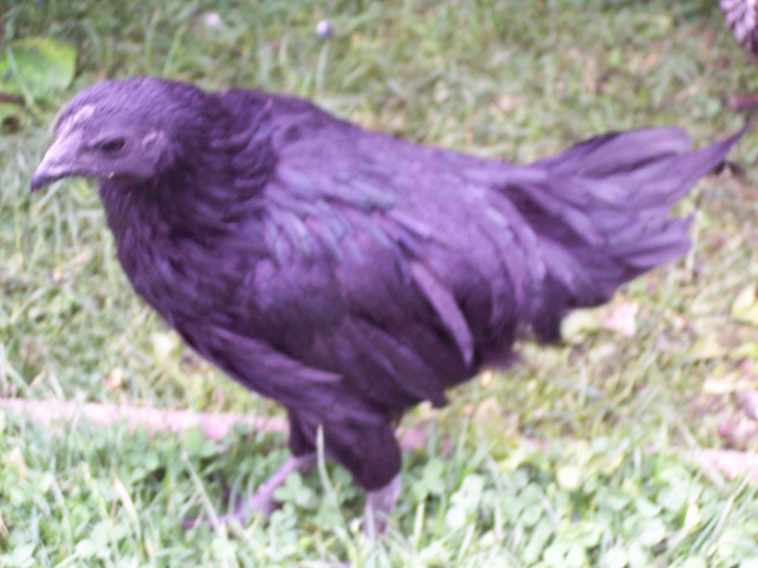 Now there solid black in the sun they can solid purple at angles like no other bird in the world!! The have alot of hair to beside long thin feathers unlike normal chicken feathers this is a young cemani.