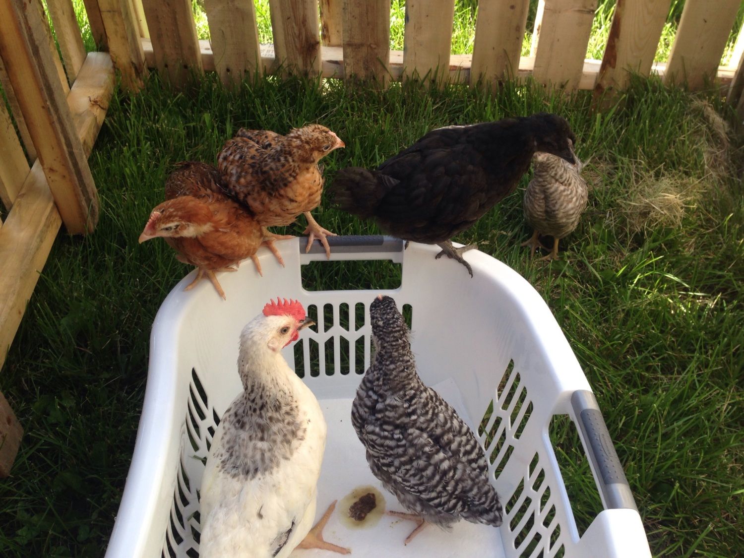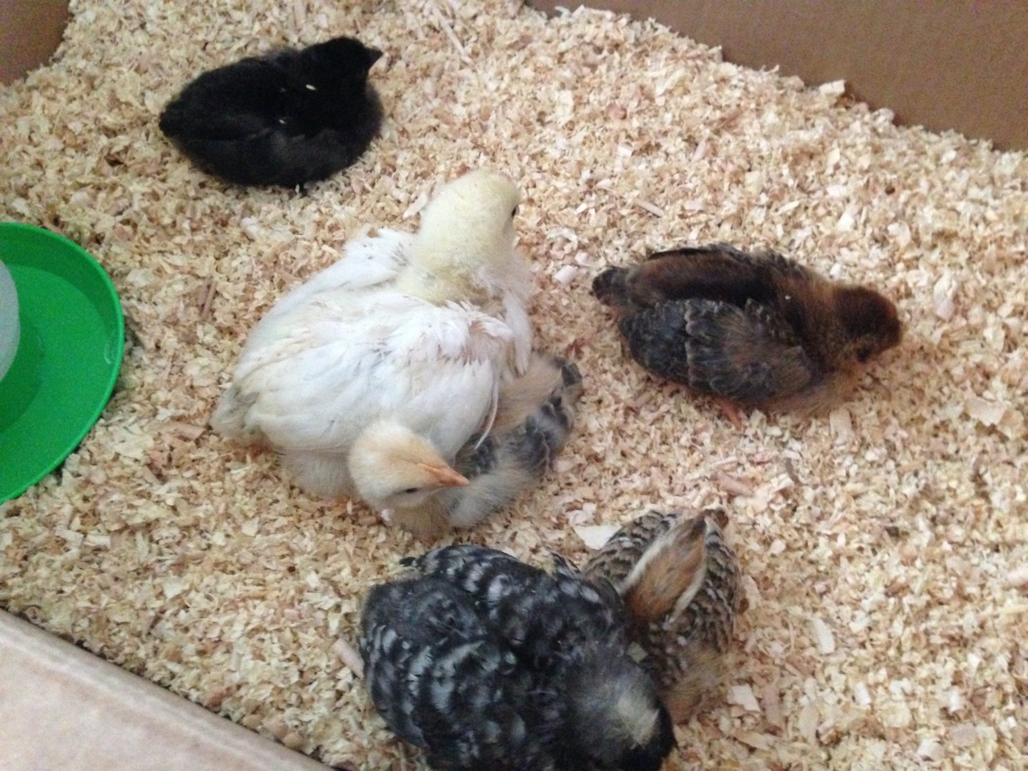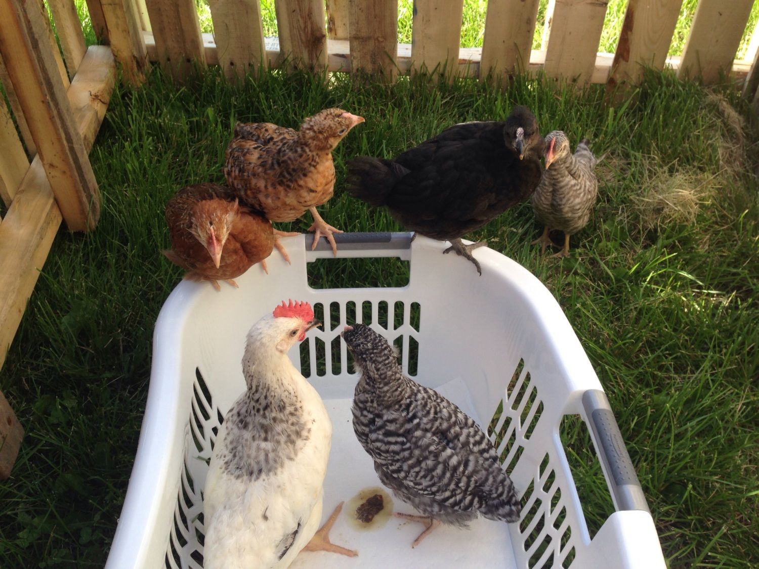 Here are pics of her now, and the top one is of her when I brought her home at one week and now she is 7 weeks. Also - if you have any ideas on gender, that would be lovely. I have six chicks, and three are roosters so I'm really hoping she's a she. Her comb is almost non existant - but because I don't know the breed it's so hard to know if that means anything. Sorry I have none of her on her own, she is very flighty but she is my only all black chick so you can spot her in the pics below. (If you click on the pic you will see it bigger on the screen) You can't really see the sheen to her in these pics, but I promise it's there!