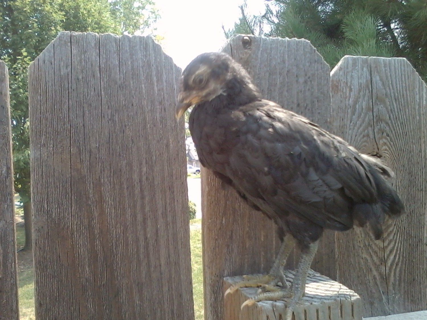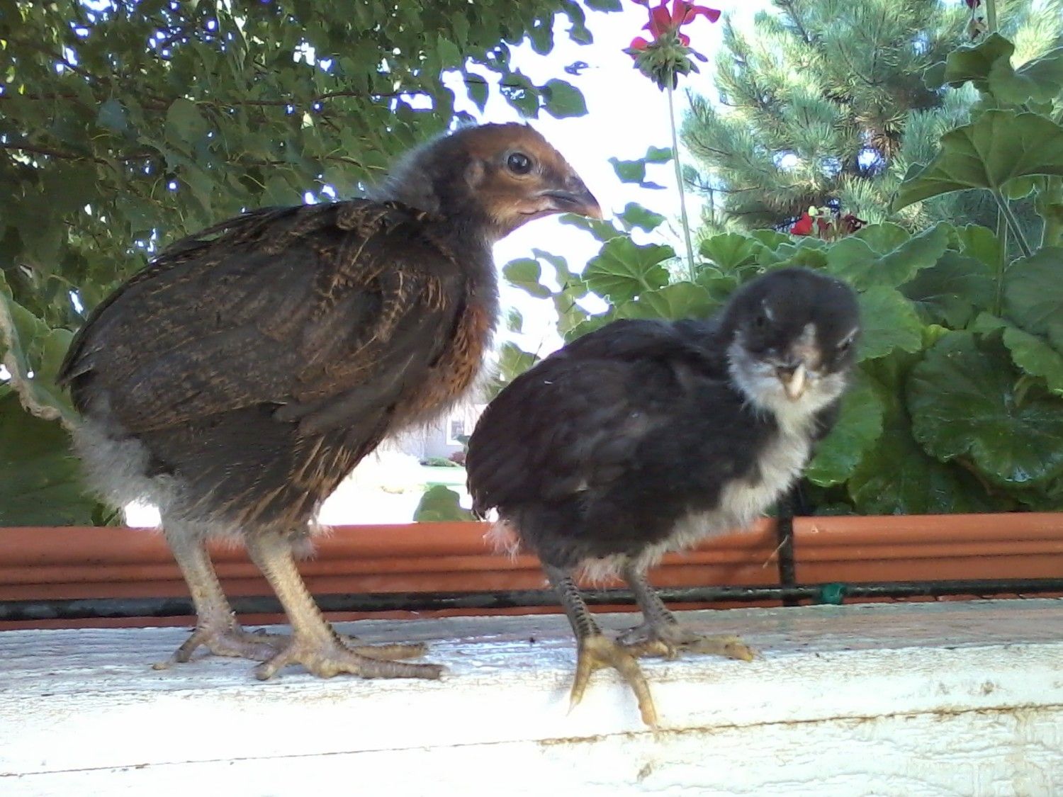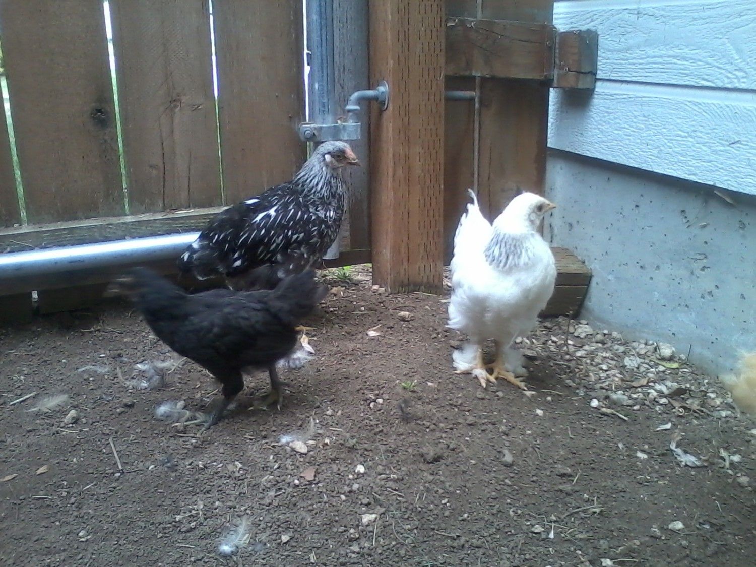 and one has some red (I'm sure outside influence)... he's got a lot of pin feathers showing too (neck). Still curious to see what he ends up looking like.