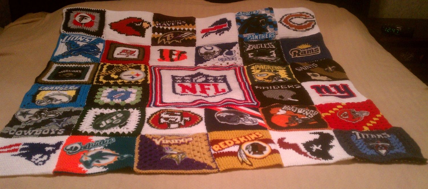 OH! I love those! Love the NFL blanket too! That is seriously amazing!Finally got the rest of my NFL squares completed and put together.... I am working on a border but thought I would share.