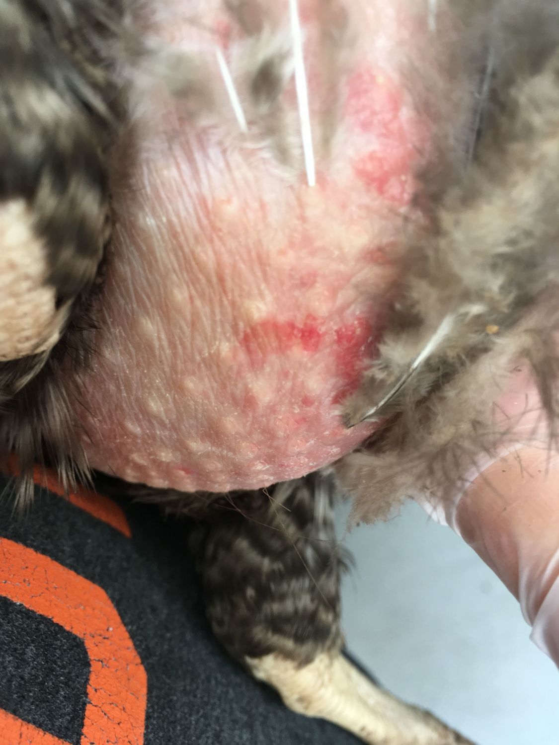 Hi I've noticed this red marking on one of my chicks. She is 28 weeks and has alwAys has a bare behind. She is the head of the pecking order. I have never seen her feathers getting pecked or have ever found any feathers from her in the coop or pen. I wonder if she is removing her own small feathers before they have grown? Or could it be red mite. I have no obvious signs of red mite and the other hens I have seem ok. This hen has been my best layer but has had a problem for the last 5 days with no shell eggs or no egg at all....any ideas
