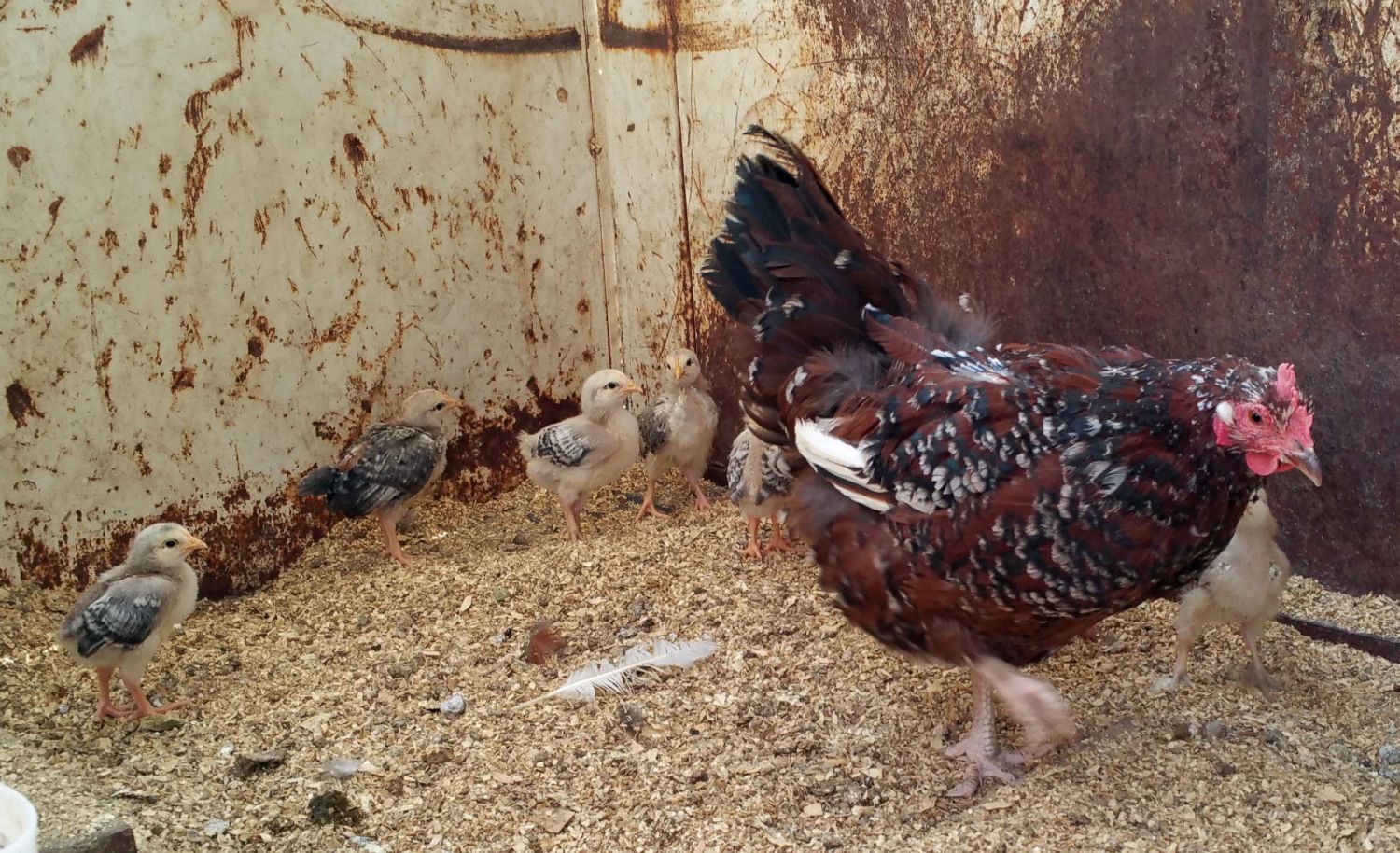 The chicks are now a month old. The Mama hen is a Speckled Sussex and the rooster is a White Rock. I have no clue if any of our other hens laid in the nest also - it was pretty secret!