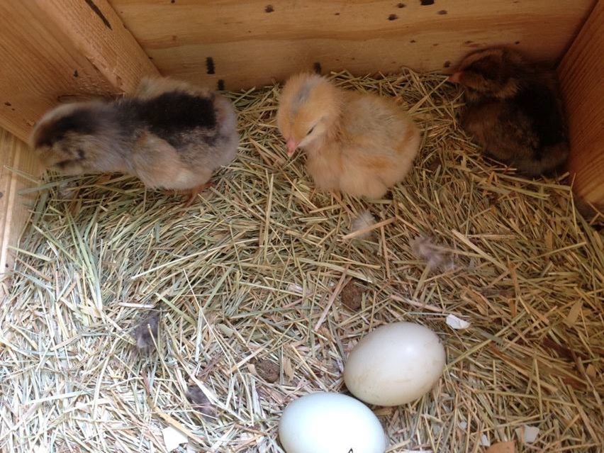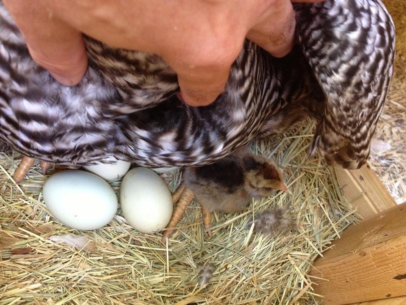 My only rooster is an Americana and I didn't want to mix breed my birds. Had a very broody Barred Rock so I let her sit on 5 blue eggs. 3 of them hatched today and there is a peep hole in another!
