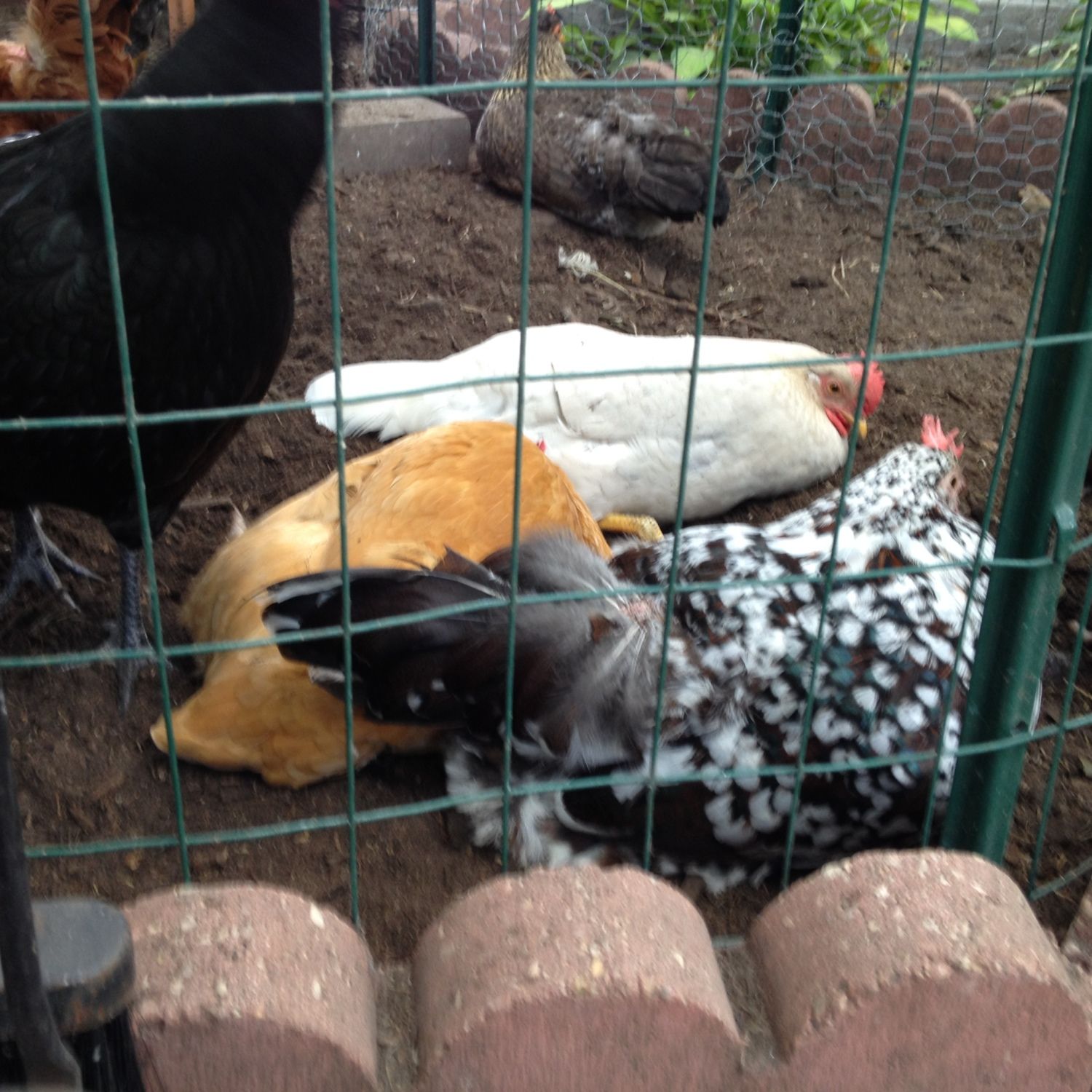 I gently picked up each bird (they weren't going to move in the dark) and I gently put each one inside the coop. They were talking! Not too happy with me. Then I watched and finally saw, that because it was dark and they were so wet, they could not get on their roosts. So back into the coop I went and lifted each up to the roost. Then they quieted right down.