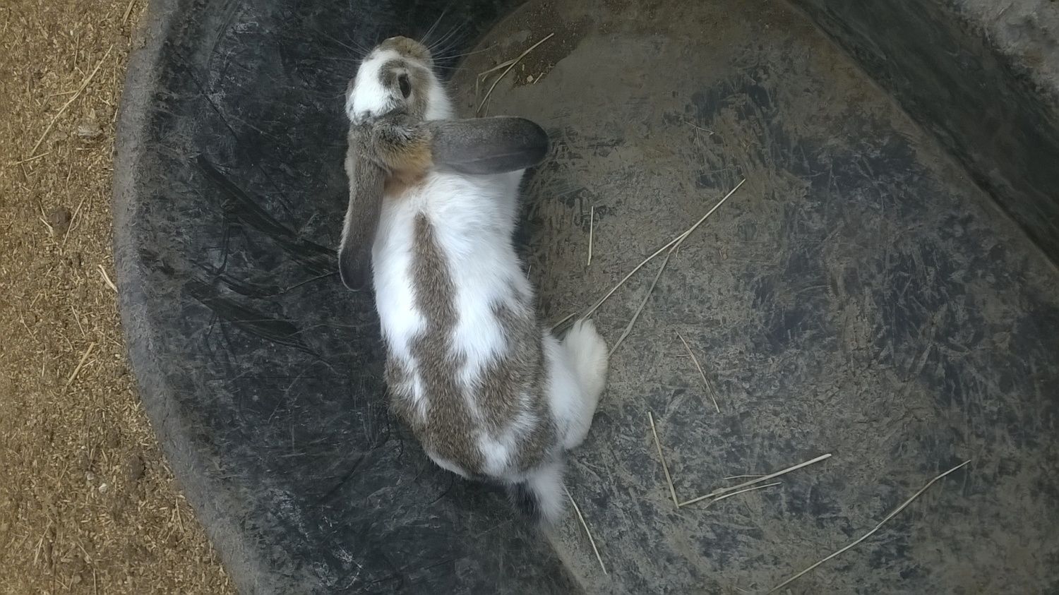 Here's one of the 3 month old market rabbits in a squirrel cage. This one is one of the bigger ones