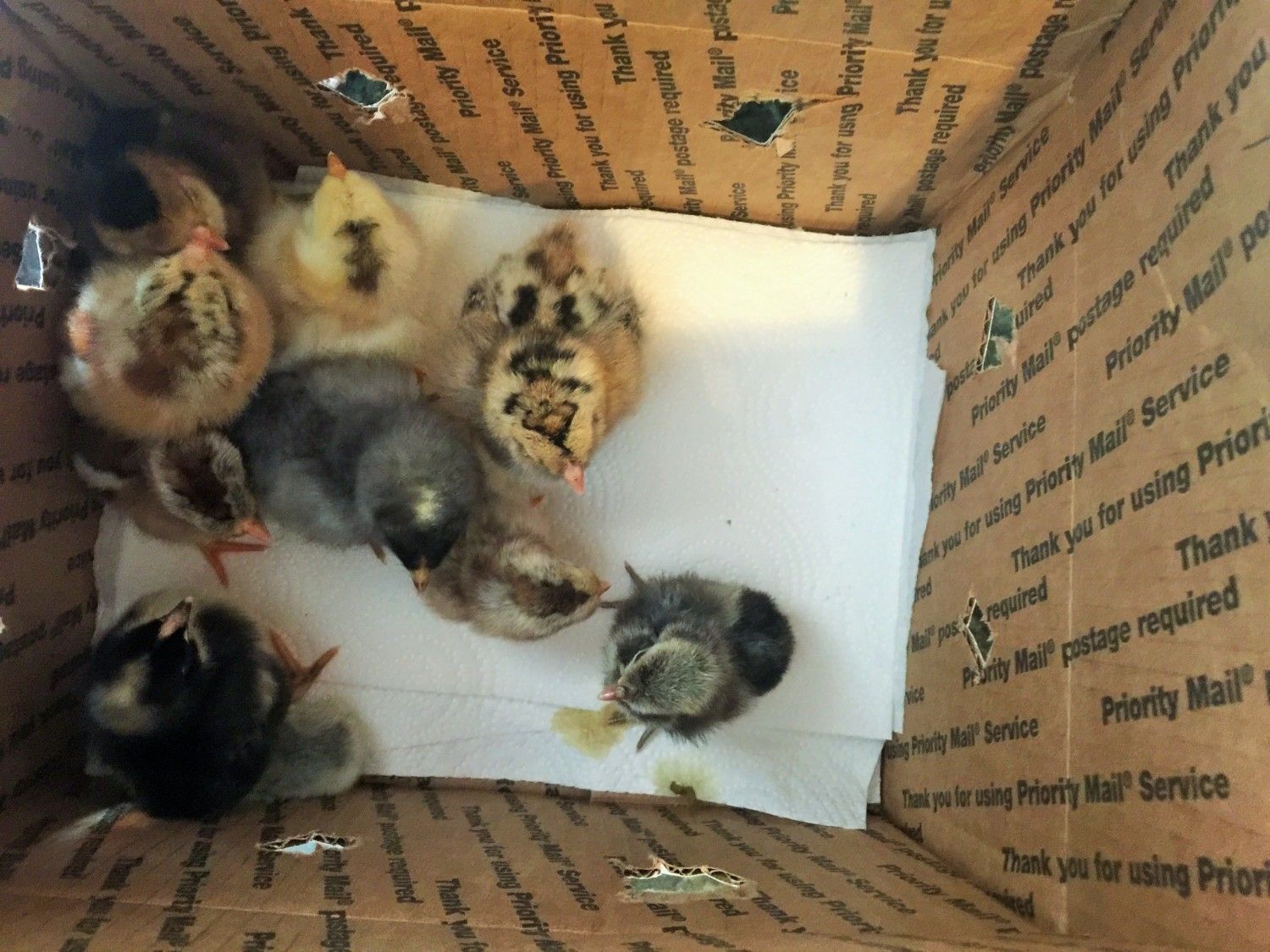 Here is q picture of Holm's new chicks..Before he even gets them. They are travelling first class Pony express. They get the luxury of being held in the box on a lap the whole way.