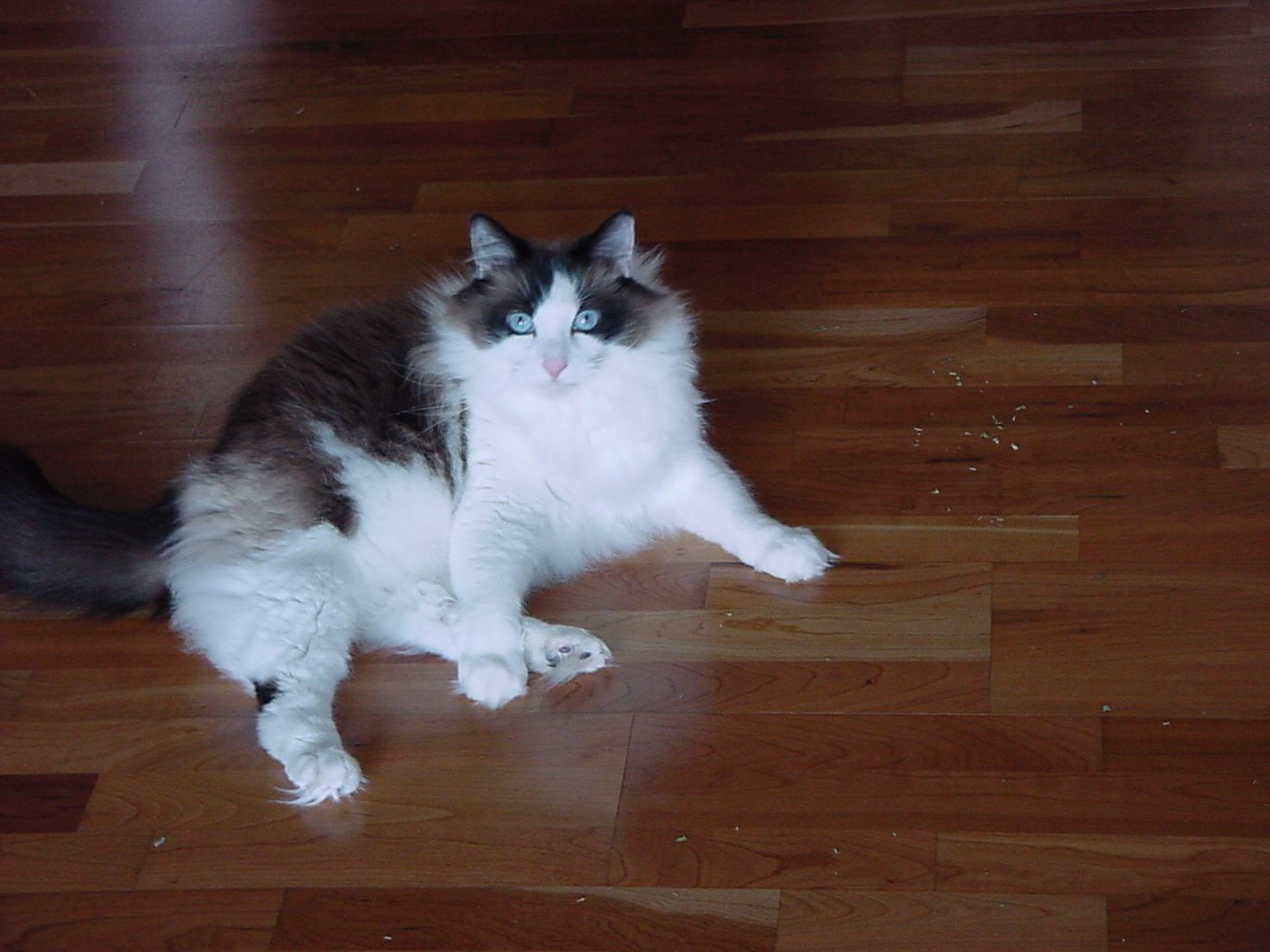 Looks just like 2 from my litter A friend of mine lives on one of the major county roads leaving town from the north and he always had animals and garbage dumped by his place and in his ditches. He figured out it was because his fields and house are approximately '1 cigarette length' from town Aka it takes the same amount of time to drive to his area as it does to finish one cigarette, dump their junk, light a new one and head homeWhere we live cats get dumped off I think from people in the cities. It's pretty sad. We have one now that was dumped along with 4 or 5 others he was the friendliest so were able to catch him, he was already fixed. A few years ago 2 others showed up and I took them to a vet that spays and neuters very cheap but it was like a 70 mile trip each way. Gave the female away and kept the male but he disappeared that same year, we think a fischer that had been hanging around got him. This past summer on my drive to work there was another 3 at least, that I saw 2 had been hit along the road and another very young cat hanging around the dead ones that I couldn't catch, day after day the poor kitty was wondering around the area. I saw someone else trying to get it but it was so scared. I hope it found a home eventually. .This is Pokey.