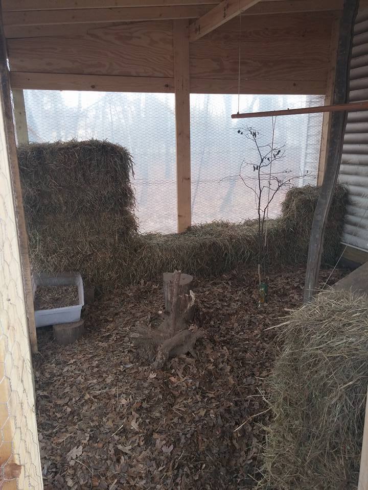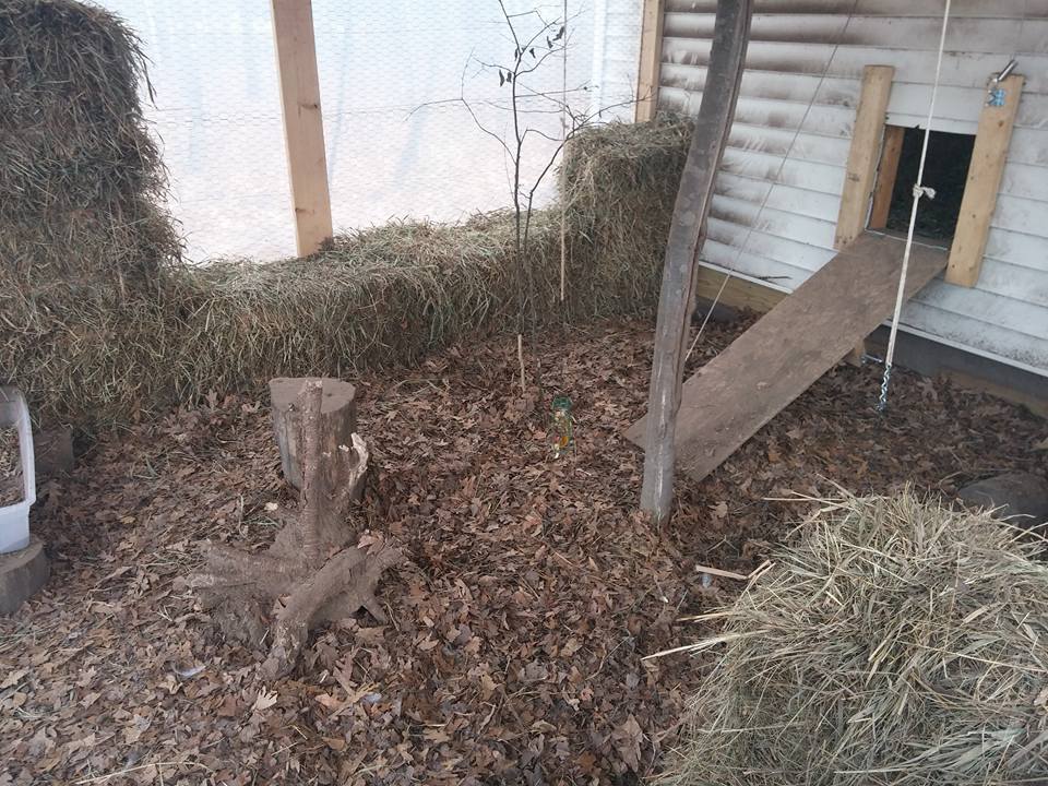 Very nice...Hey BC, all is well aside from the tarp mishap! If it becomes too big of an issue, I'll double wrap it with thicker material. Okay, DH willI'm almost worried I may have too much ventilation in the coop, but it doesn't feel "wet" in there, which is good. From what I can tell, it's not too drafty either. It's just cold! We shut the two vents that are lower as most of the girls pile up around that area. I wish I could get them to roost. I'm still waiting for my 200ft of cold weather extension cord to come in the mail. Should have just went to Menards. I can't hook my heated dog bowl up until then. Now, I'm just hauling warm water out in the morning and when I get home from work. We saved the little Charlie Brown tree in the middle just because it's special like that. We also need a few steps on the pop door still. Look at that dust on the siding! They love the leaves though and it keeps their feet off of the cold ground.