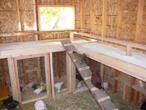 I went back and found some photos of my coop as i was building it last spring. see my flip up roosts made of 2x4s and the angled poop board with gutter. you can see the taping knife hanging over the window that i use for scraping poop.