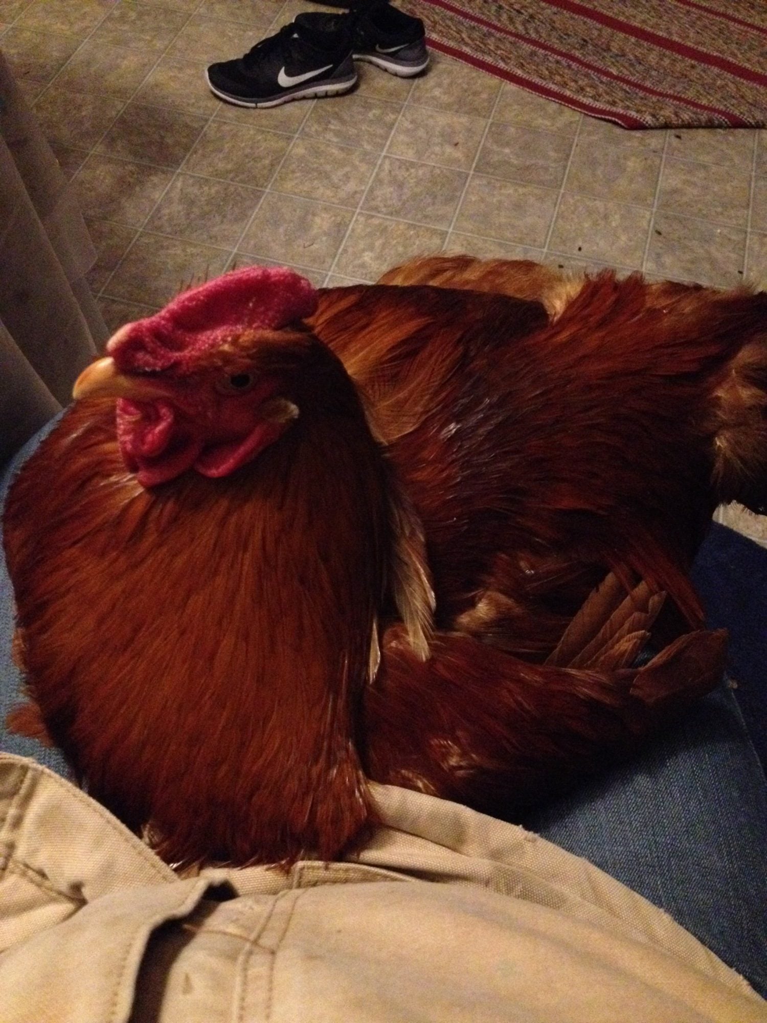 I have 1 Barred P/Rock she will waddle as fast as she can over to me and drop down,, ive almost tripped over her more then a few times.. so i just scoop her up and tuck her under a arm and walk around with her.. now i realize she does it on purpose. my hens never liked me petting them let alone hold them till they got older and started to lay eggs.. I think they think i am their Rooster..LOL... James and Roostie are going to be busy boys when they finally get outside.. LOL...