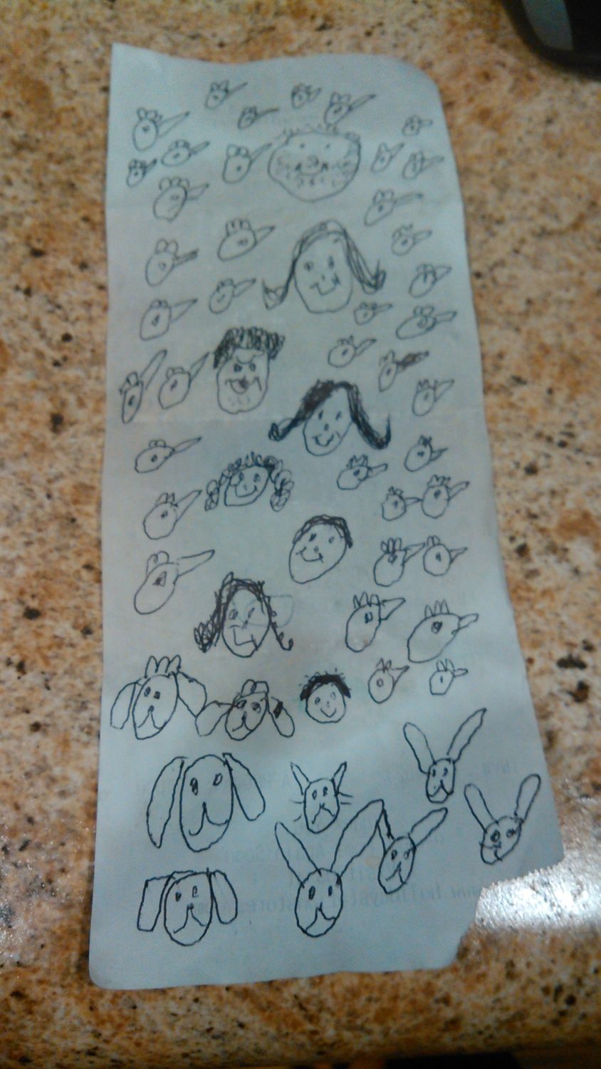 I thought there were too many dogs and not enough bunnies (people and poultry are accurate, though!), but she had also drawn the ram wethers and told me we don't count the baby animals, just the breeders. This kid always gives me a laugh.