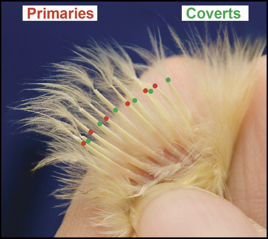 See how this chicks feathers are all the same length? That means it's a cockerel.