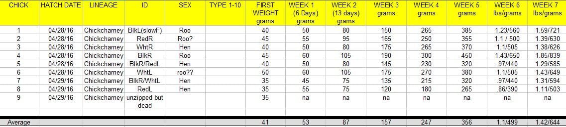 I've been following this and a few other threads also concerning sustainable meat birds. I started over a couple of years ago with Delawares. I haven't been able to get selective on breeders until this year. And, of course, I didn't weigh the 4/22/16 hatch until they were 6 weeks old.
