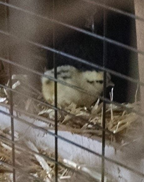 So light yellow/white down (looks whiter in real life than in this picture) with very black chipmunk markings, black eyes and grey/green legs, grey/black beak. That leads me to believe that my buff hen must be: Dominant white (I/I), Columbian (Co/Co),Ginger (Db/Db), gold base (s+), and either roo or hen (or both?) has e+ under their E or e^Wh respectively.
