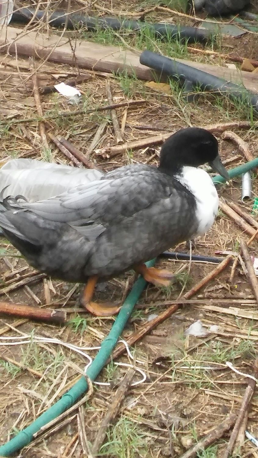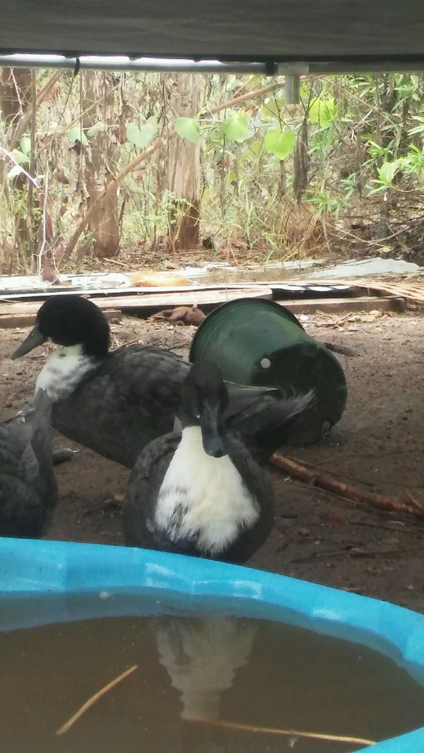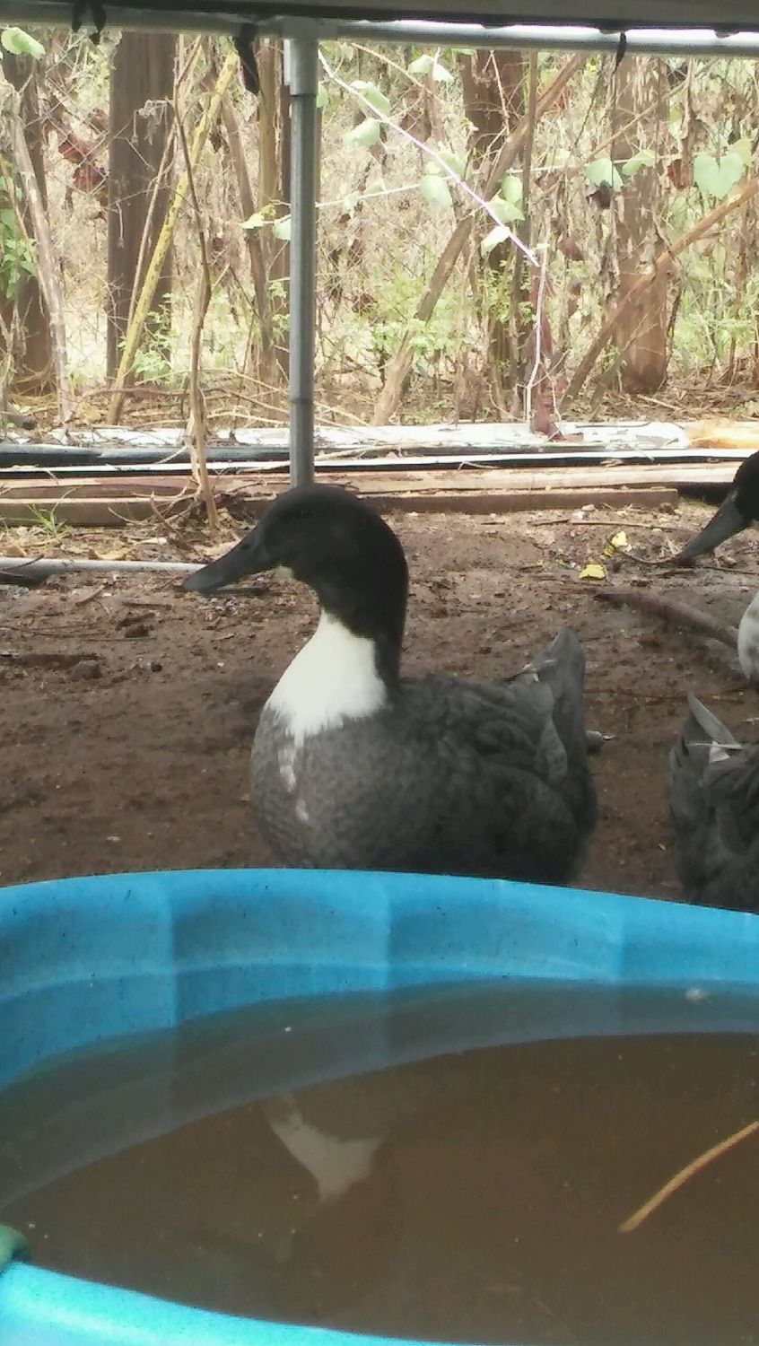 Here are some pics. The water is really yucky in their pool. They've been playing in the rain/mud all day. These are the 3 I'm keeping. The boy has a splashed bib so I am using him for showmanship. I have a choice of the other 2 for quality. I know their chins are white which isn't good but don't know what else to look for. If you need better pics I can do that. This is for 4 H so they don't have to be perfect and there is very little competition for ducks. They were born in April and are still changing head color as well as a few feathers on their back. One girl has 3 white flight feathers on one wing and 2 on the other. The other girl has 5 on each side. I heard the feather number should be equal but also heard that there should only be 2 or 3, and 5 would be a lot. I don't have the ones I'm selling back yet but one of these girls will also be up for adoption. They are very tame, sweet ducks.