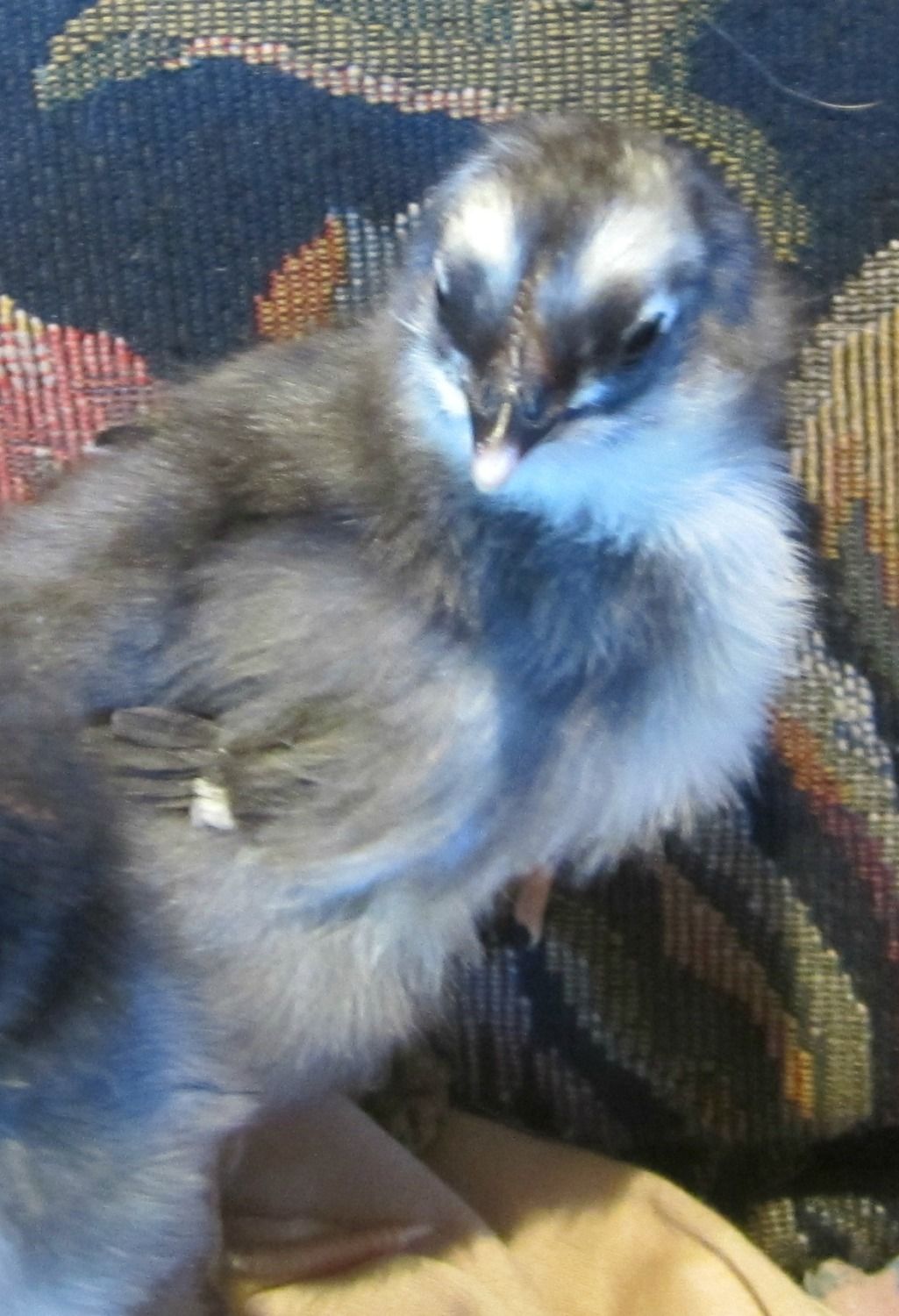 I had my incubator fired up with diff eggs to hatch, and stopped by my friend's farm because I had room for one more egg. The Dad was a red SFH with blue base, the mom a dark grey SFH. This guy came on Weds.