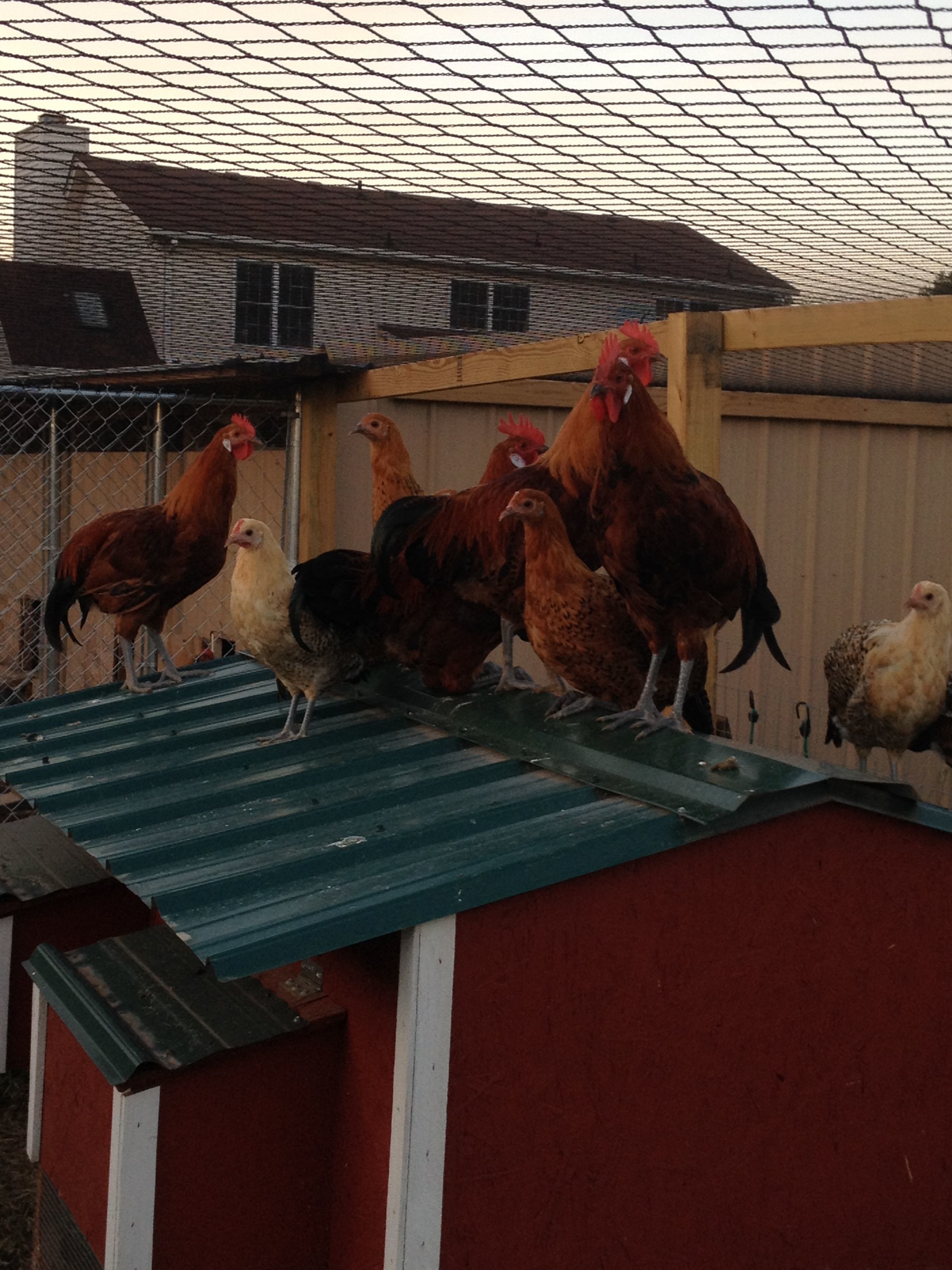 Over the smaller pens, we used 6' chicken wire. If your area is larger than 6' but you have a good stable fence, you can use it in 6' strips vertically across and use hog rings to connect the strips.