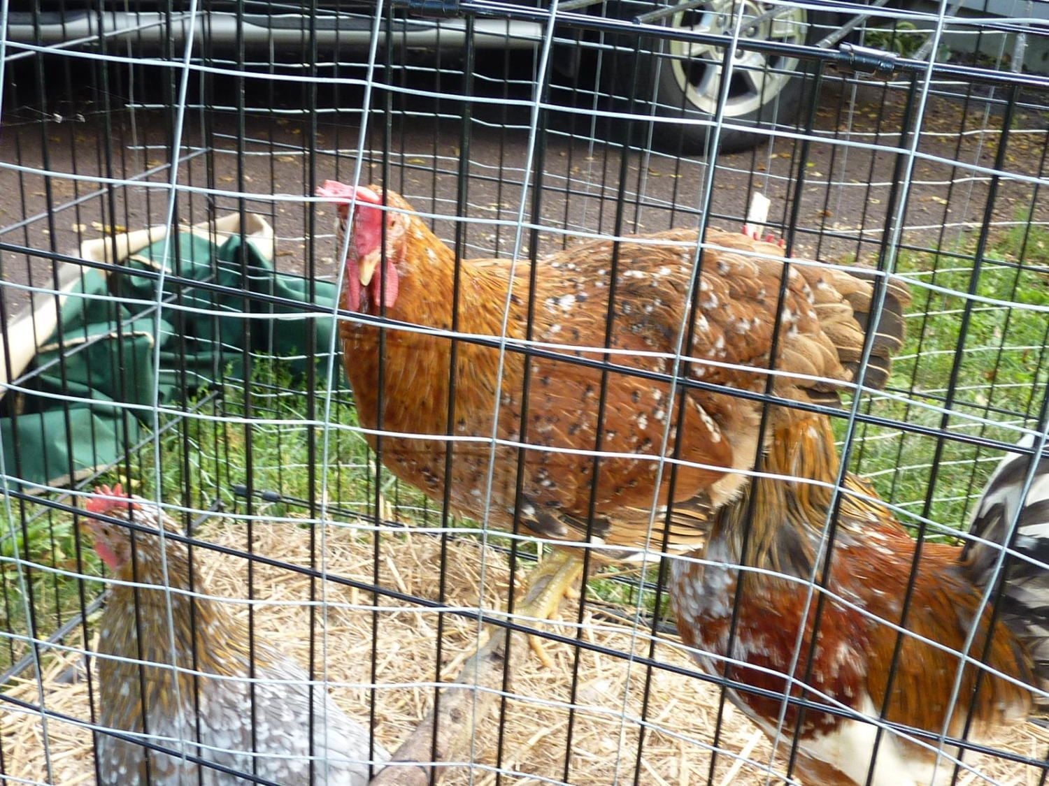 I went to do a bedtime check and popped open the rear of the coop. I noticed the feeder was low on feed and took it out. It's a hanging feeder that holds a couple pounds of feed.