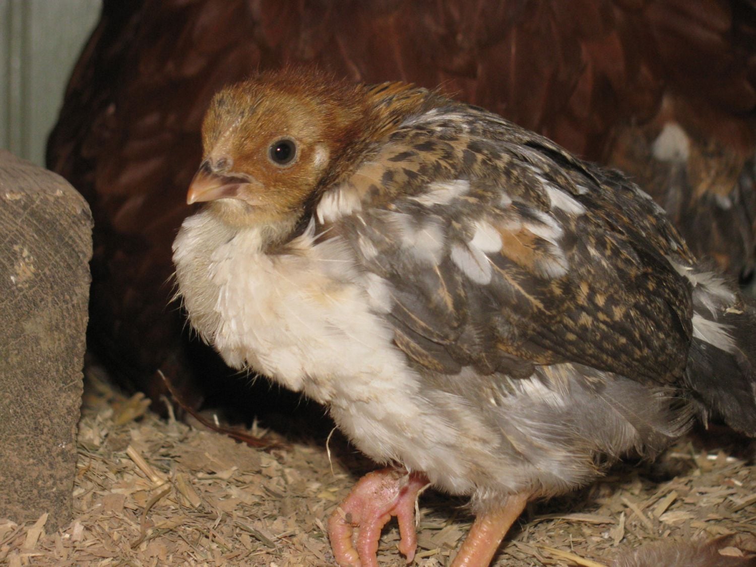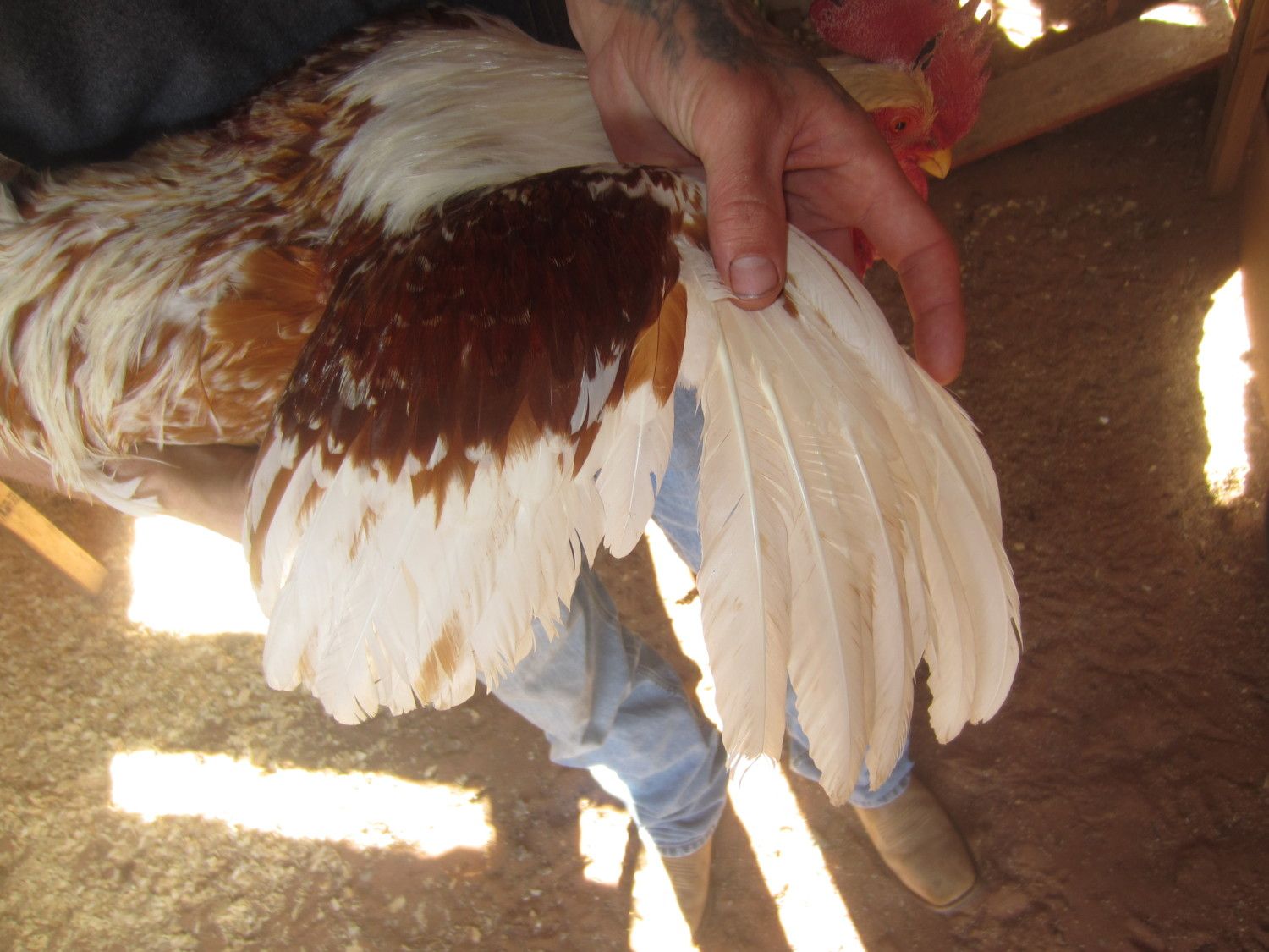 Well, I don't know what to do because all of my Swedes have this trait, with the exception of the mille fleur above and one white/red crested hen. Some are so bad their primaries just hang down. I may have to live with it. Don't have enough coop room at the moment to get so many chickens at once, wait until they grow out and cull. Too bad because I really like Gabriel's coloring and he has a beautiful comb, decent tail carriage. He turned one year old around Thanksgiving, 2012, so probably nothing will change.