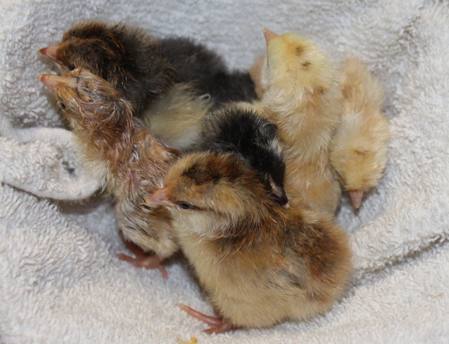 I took them all home and situated the "special needs" baby in my hatcher to keep it separate and put the others in my baby pen in my coop. It's heated and there is there is a heat lamp in the brooder part. They all settled right in with my 2 home-grown SFH chicks (2 weeks old) and a Dark Cornish chick that hatched the same time as my 2 SFH.