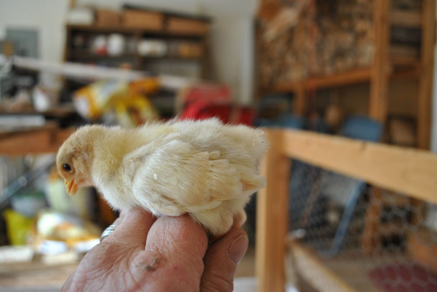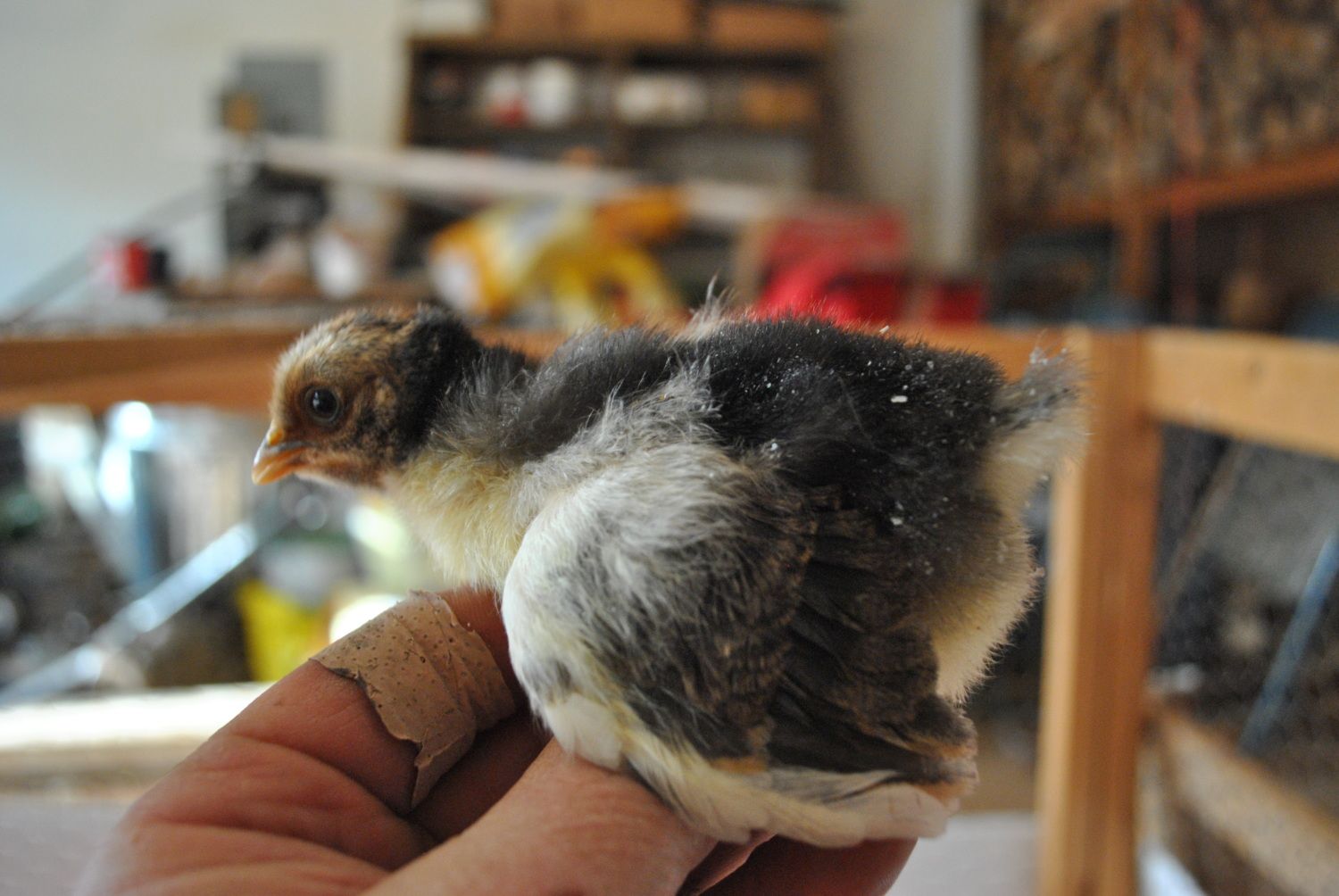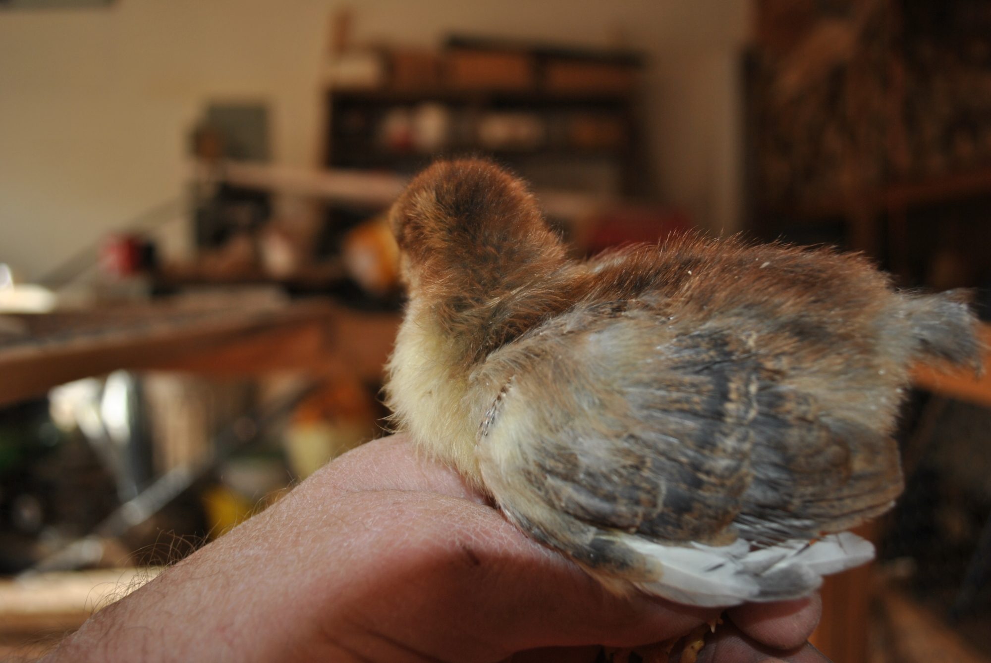 I'm particularly intrigued with this little one, she seems to be feathering in a buff color that I've not seen before. Its kind of difficult to see in the photos, but it is a beautiful light golden color. I know that you can never tell what color they will finish out this early in the game, but I'm really interested to see how she develops.