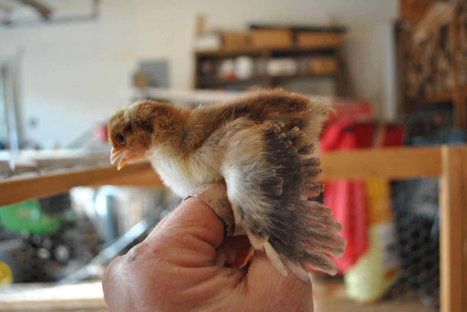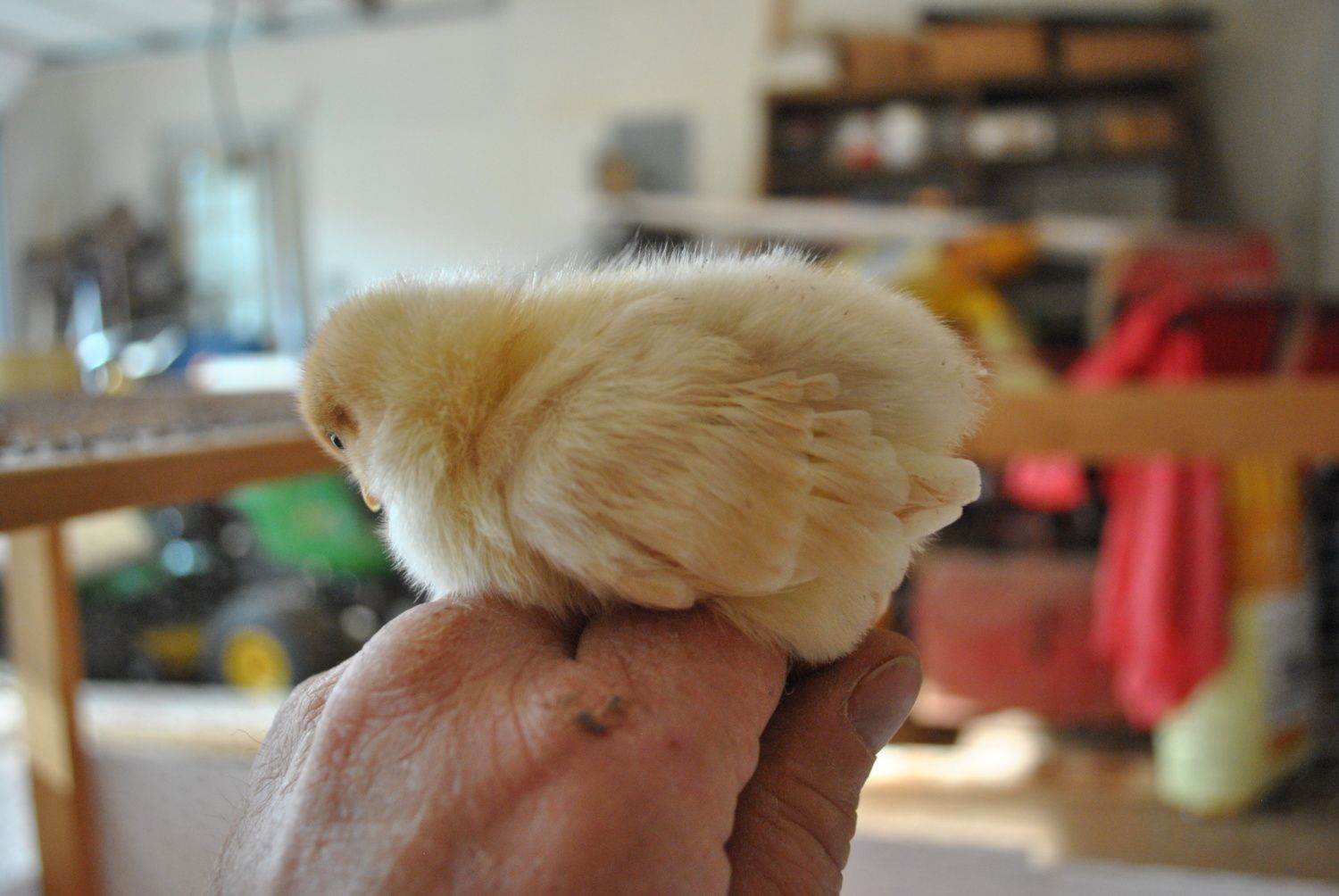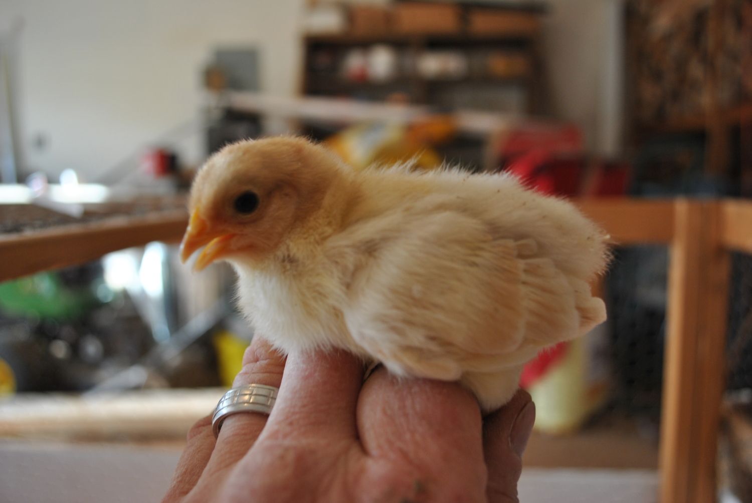 I'm particularly intrigued with this little one, she seems to be feathering in a buff color that I've not seen before. Its kind of difficult to see in the photos, but it is a beautiful light golden color. I know that you can never tell what color they will finish out this early in the game, but I'm really interested to see how she develops.