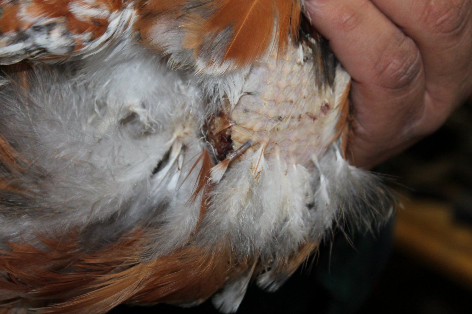 took a pic of his injury today too, with hubby's help. the upper portion the superglue held it together long enough to seal up (up in the feathered part) but i think filling his crop is what caused the glue to let go... but it's healing so