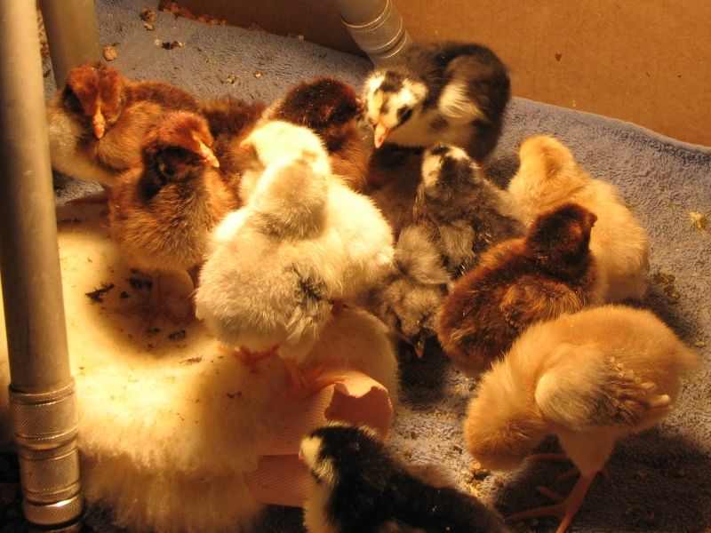 I think this has most of the SFH chicks, the Black ones, the white ones and the Buff ones are all SFH. The brown ones are Barnvelders or Speckled Sussex. I hatched out 2 Black, 2 Blue, 2 White? 1 Splash? and 1 Buff. I am keeping the Black and the Blue ones.