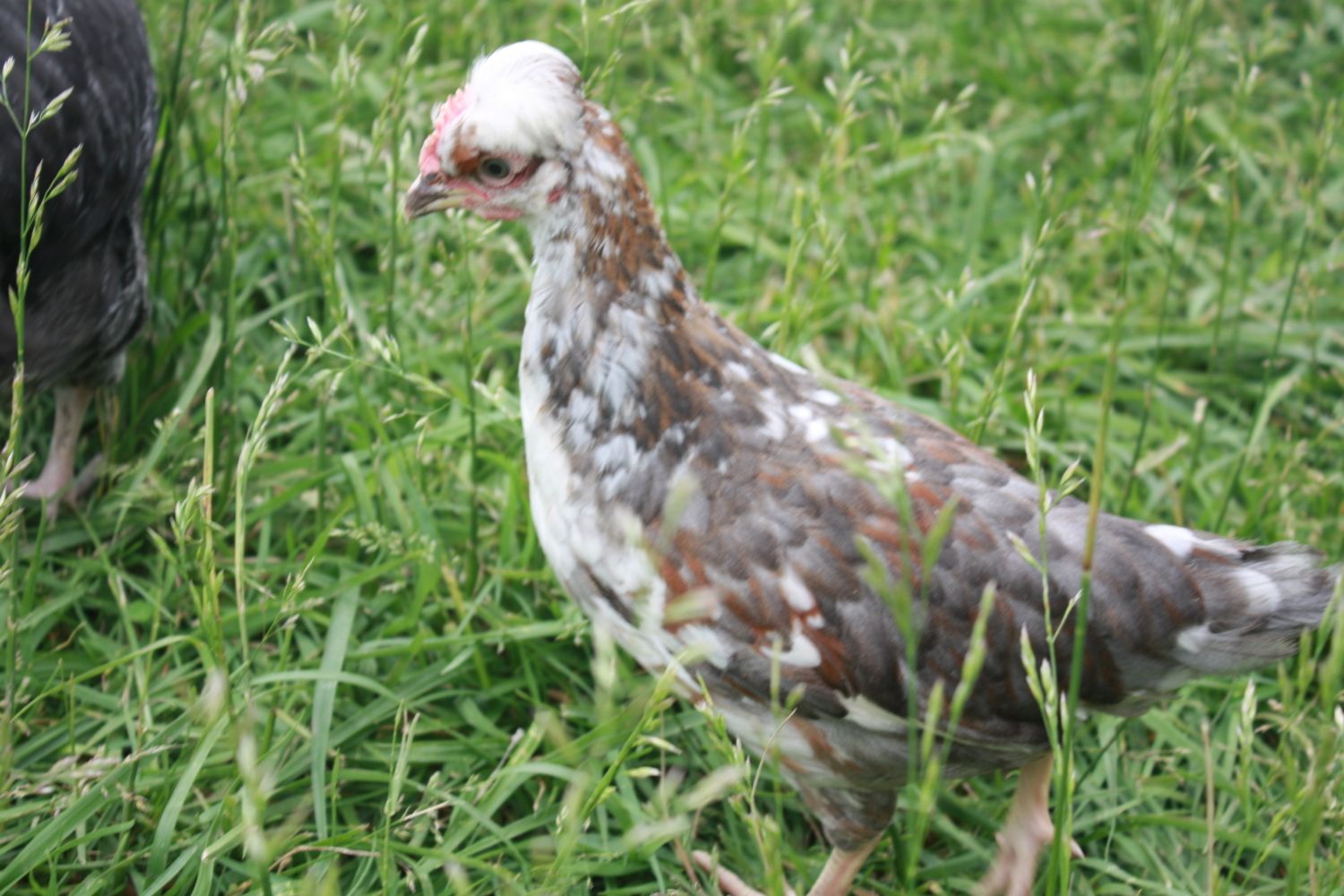 he's only a mutt, but i thought this thread might be interested to see a photo of Max Junior, my six-week old SFH/crested cream legbar cross -- his feathers are fascinating-looking! they're almost plaid in places... (click the photo to get a larger view to see the feathers better)