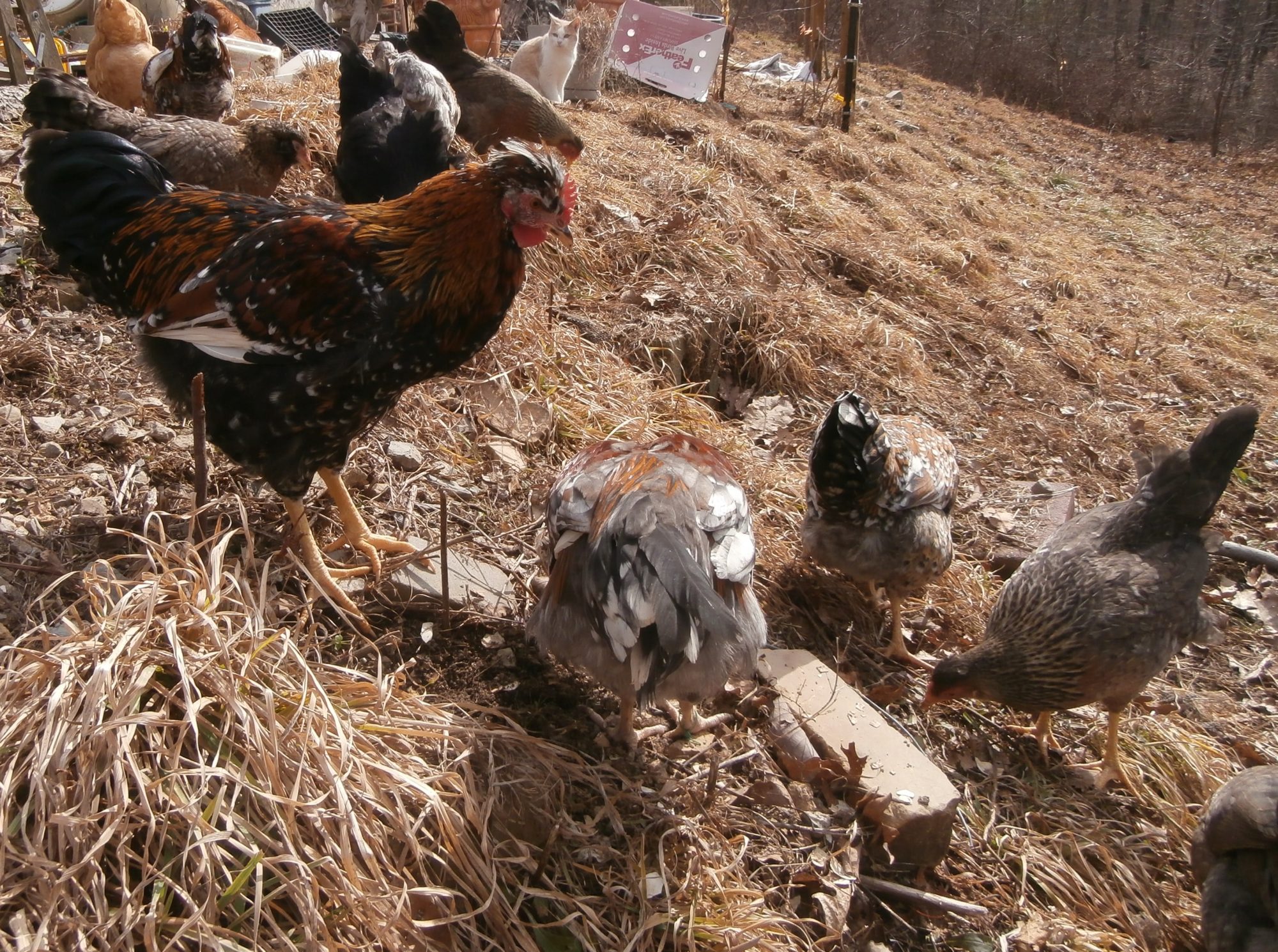 BV free ranging today w/ the current group, so far he is keeping peace w/ 3 other sfh cockerals plus at least one mutt boy who is leaving soon...