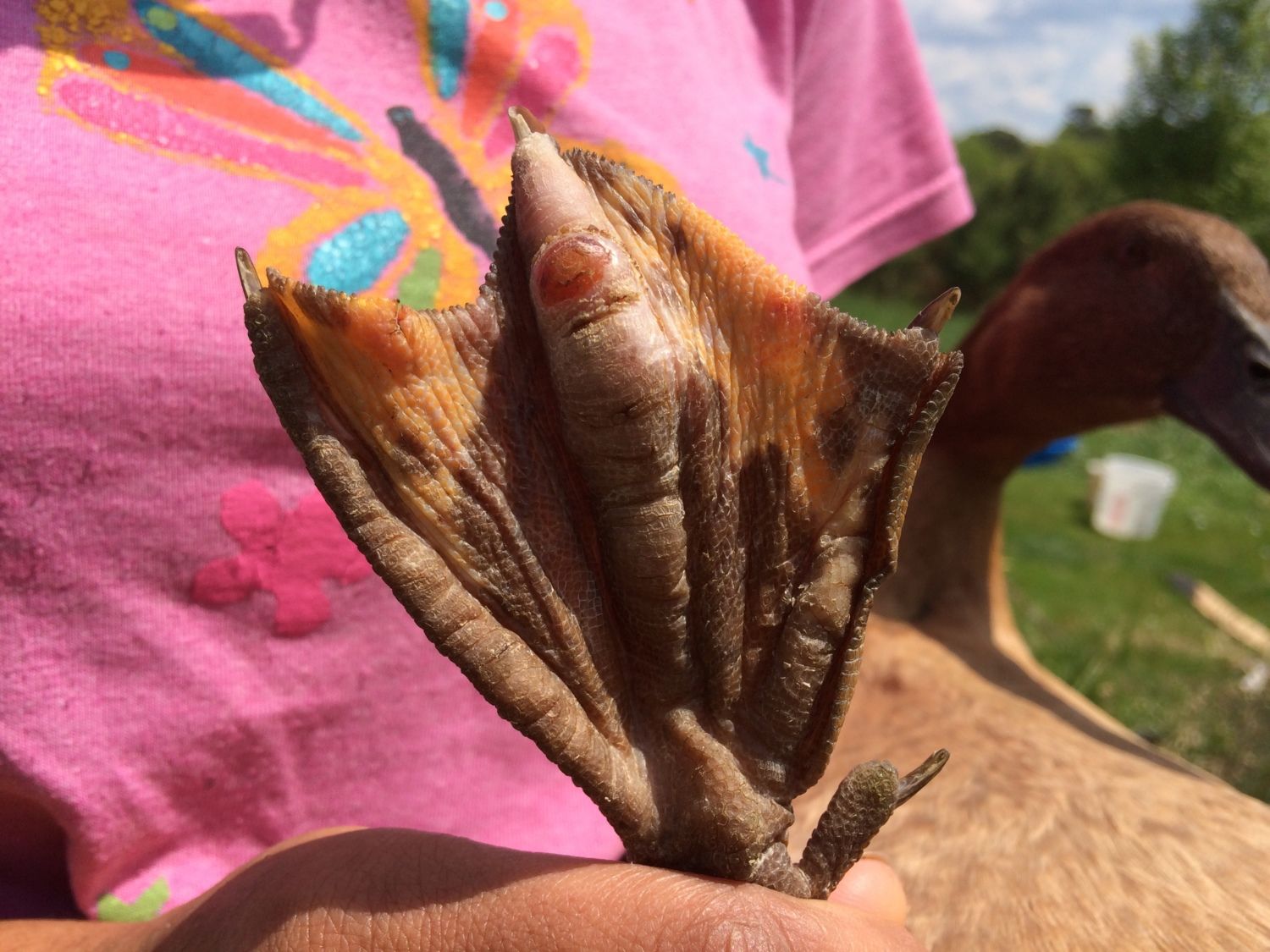 One of our ducks has a lot of swelling on her middle "toe". There is also a redness and a moderately large scab on the bottom of her foot, but doesn't have the tell-tale black scab of bumble-foot. The foot is also hot to the touch.
