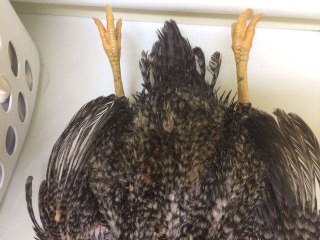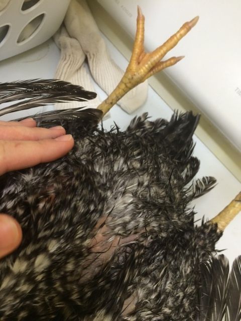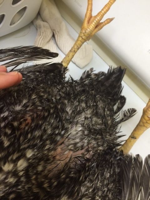 Here's a couple pictures of her.... We just gave her a bath, so she's still a little ...scraggily. You can see her abdomen is purplish/pink, and really swollen. Her sour crop seems to be clearing up- we've just been giving her olive oil soaked bread, yogurt, and AVC water. We're not sure where the trapdoor hit her, possible her neck. No blood, nothing out of place, we took her to the vet two fridays ago, and she had x-rays. She was stunned after the accident, but not knocked out completely.