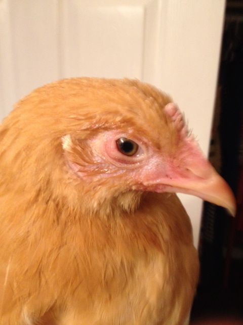 Today when I went to check on her and she was still up on the roost by herself. she seems depressed she is on the bottom of the pecking order so I brought her out of the chick yard with her favorite friend and made sure she has plenty of food, greens and water and she ate but not enough to fill her crop. this evening I brought her inside to give her some poly vi and feed her an egg. and I noticed one of her eyes is puffy and had some crust in it.