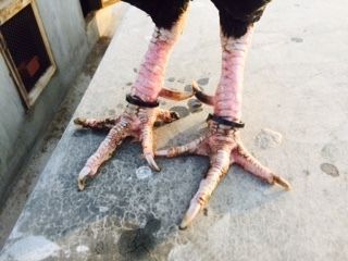 After looking at the photo it appears to me that those black leg bands are cutting into your roosters legs. Try a pair of diagonal cutting pliers or else end nipper pliers to cut those bands off his feet. To me it looks like that if you leave those bands in place your roo is going to loose 1/2 of both of his feet. Notice were the redness and swelling end, right above the bands or rings.