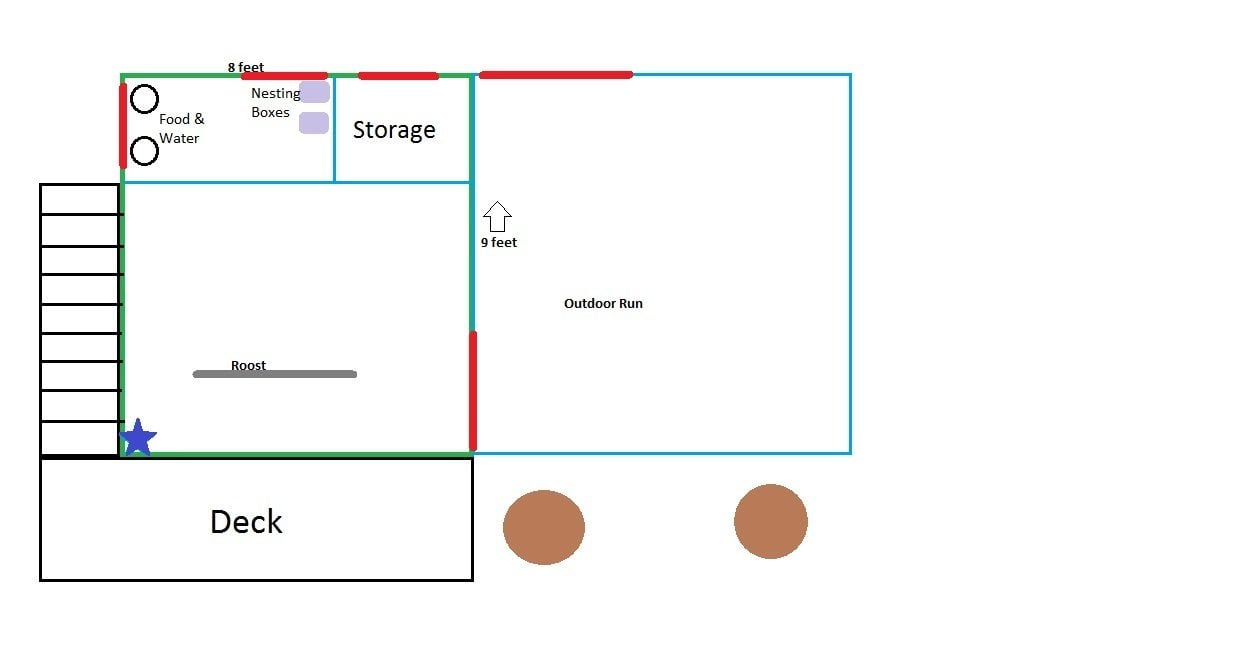 Option 3 is something in between but I’m not sure what that is. Food, water and the nest boxes can go underneath along the back wall but I would sure like to have some storage and an easy to clean roosting area. I could probably talk him into a 4X4X6 tall, double decker addition plus the outdoor space if I cleaned the house or something, but that seems a little small for a roosting area.