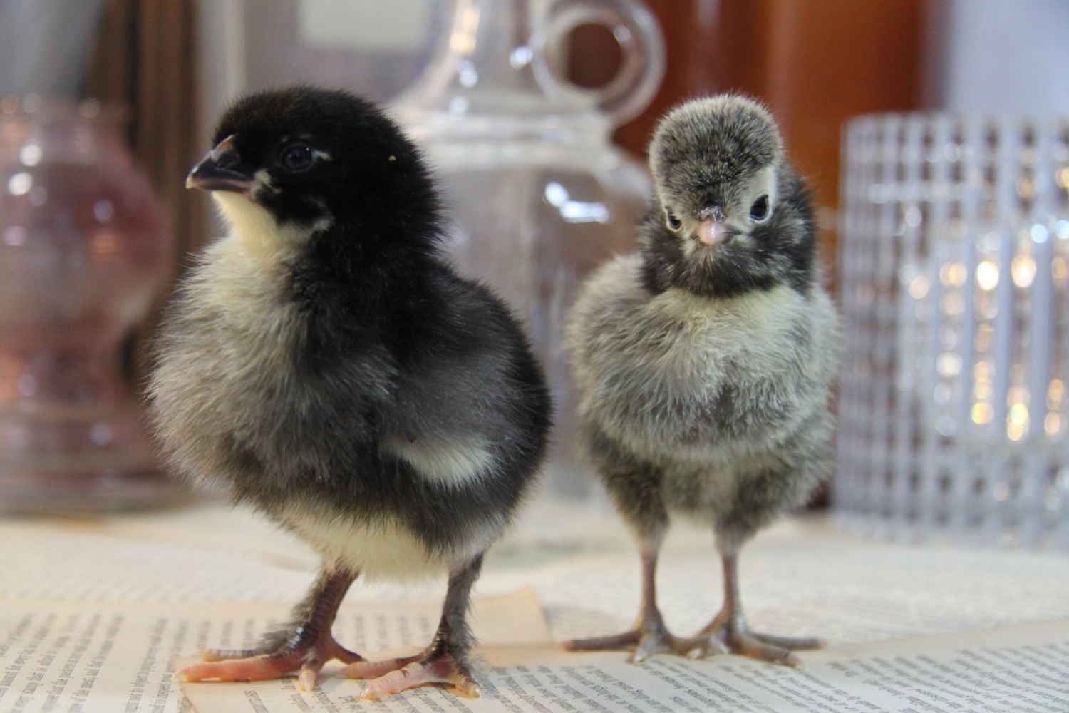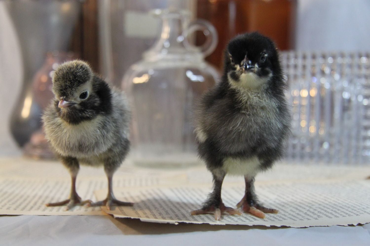 The two new arrivals. The yellow chick hatched first, and the black chick second.