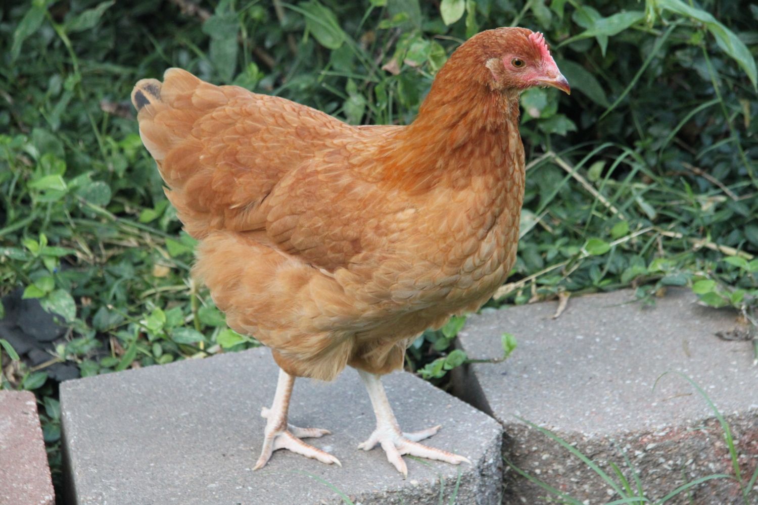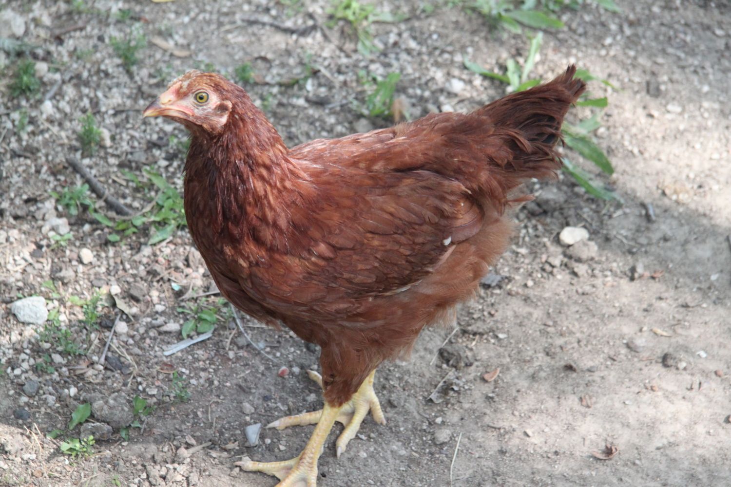 Although we have no shortage of red chickens in our flock these days, Tangerine still manages to stand out from the crowd with her smooth, red coloring and pale-colored legs. We're not entirely sure who her parents were, though we're pretty confident a production red was involved somewhere. One of my theories is that her mother was a speckled sussex and her father a P.R., but I don't know how the genetics would really work to produce this coloring. Another possibility is that her light legs came from an Easter Egger parent, though there is usually some sign of cheek puffs or a pea comb in such crosses. Regardless of her family tree, Tangerine is a sweet, mellow bird who doesn't get mixed up in flock drama, and is content to move through life with a zen and tranquil nature.