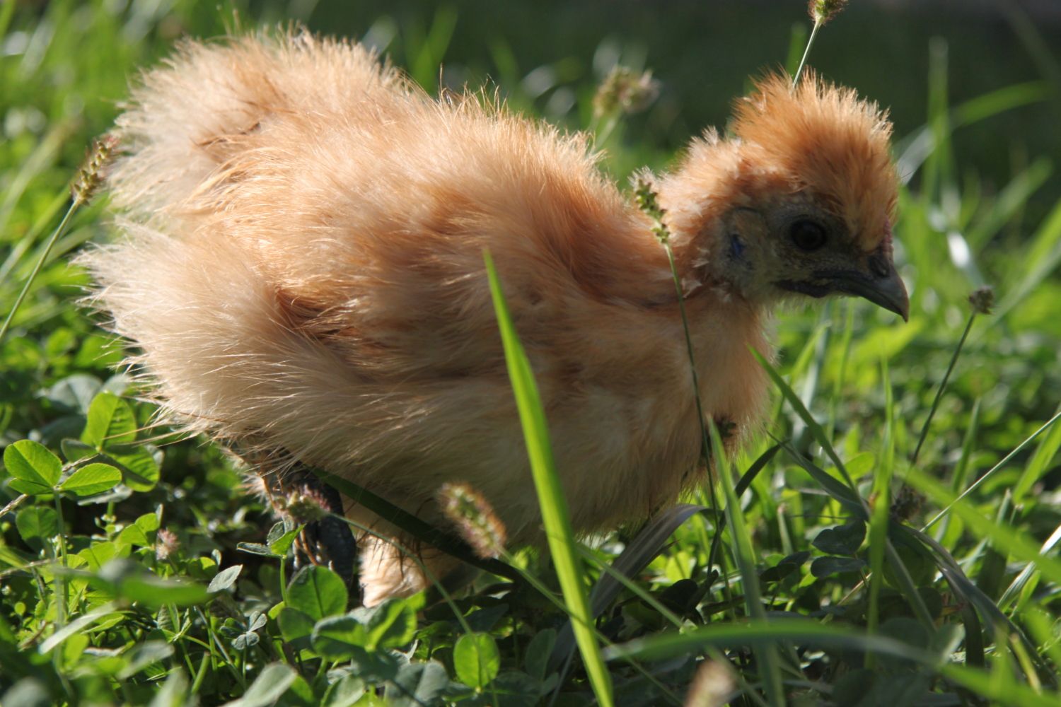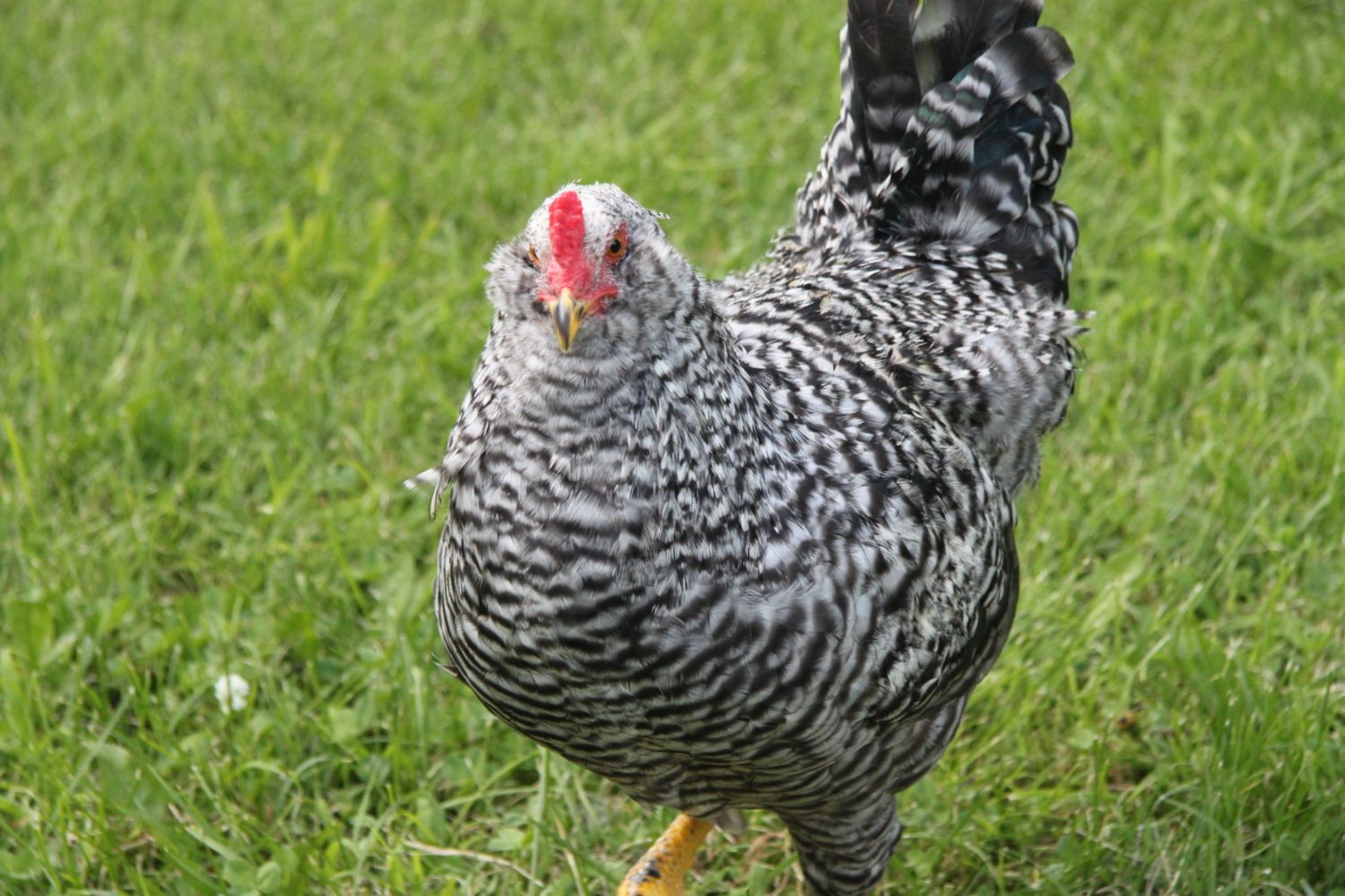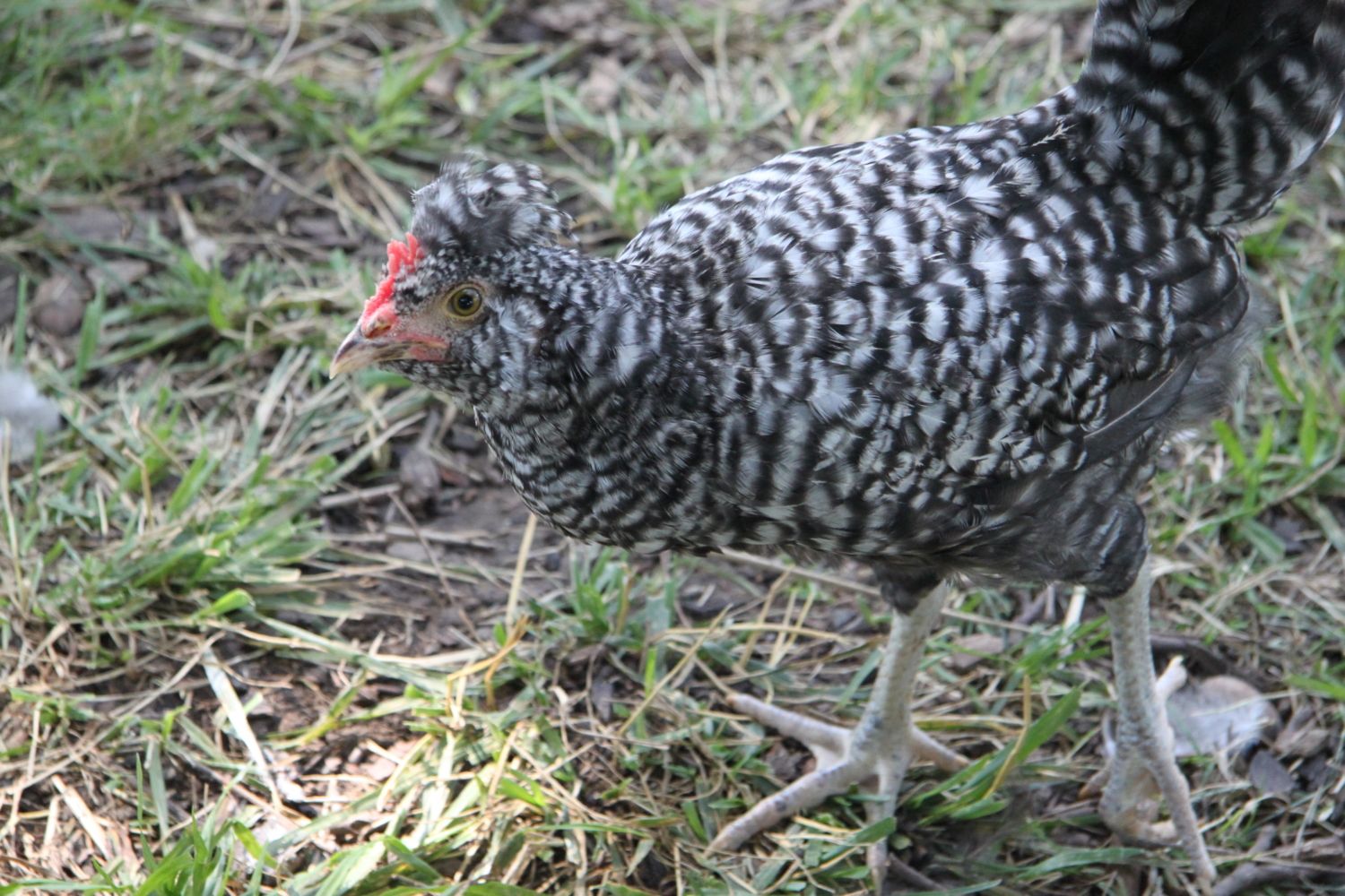 This unnamed goofball is a Polish mix of some kind. Its mother was most likely Aretha, our Silver-Laced Polish, but despite its barred appearance, its father wasn't necessarily a barred rock rooster. Time will tell if this little oddity will develop a wider range of color, as well as if it will be a male or a female. For now, it's not keen on letting anyone close enough to find out!