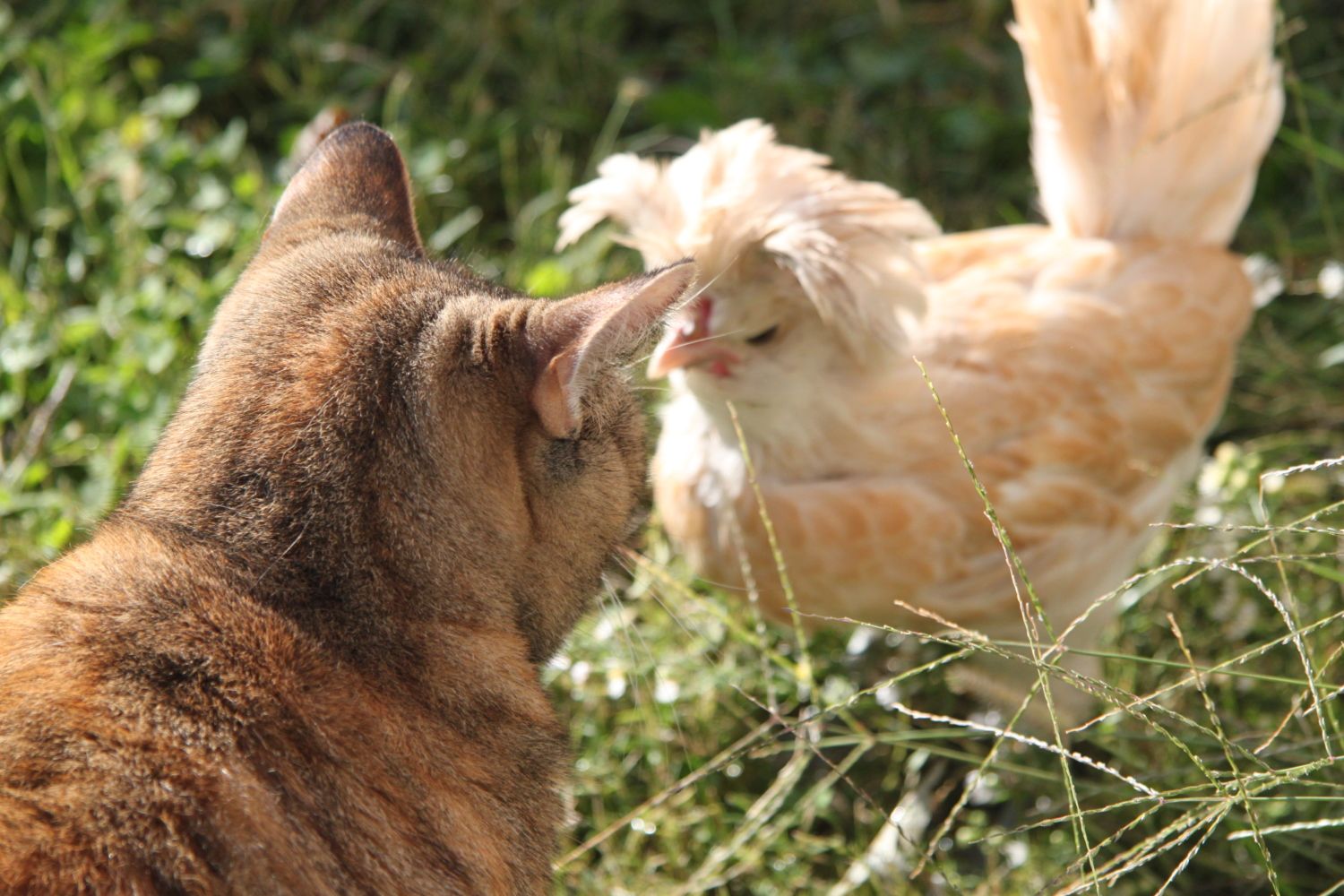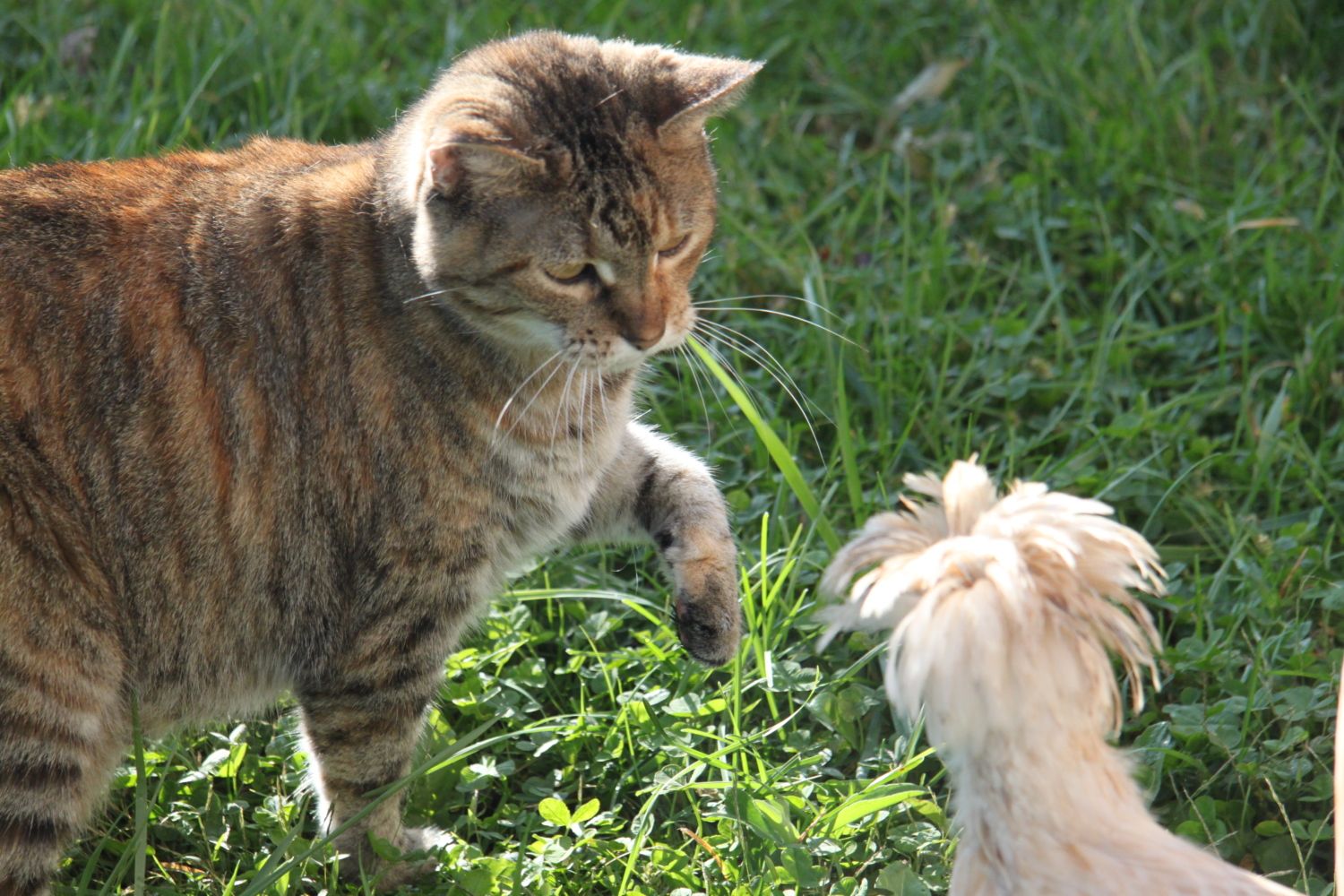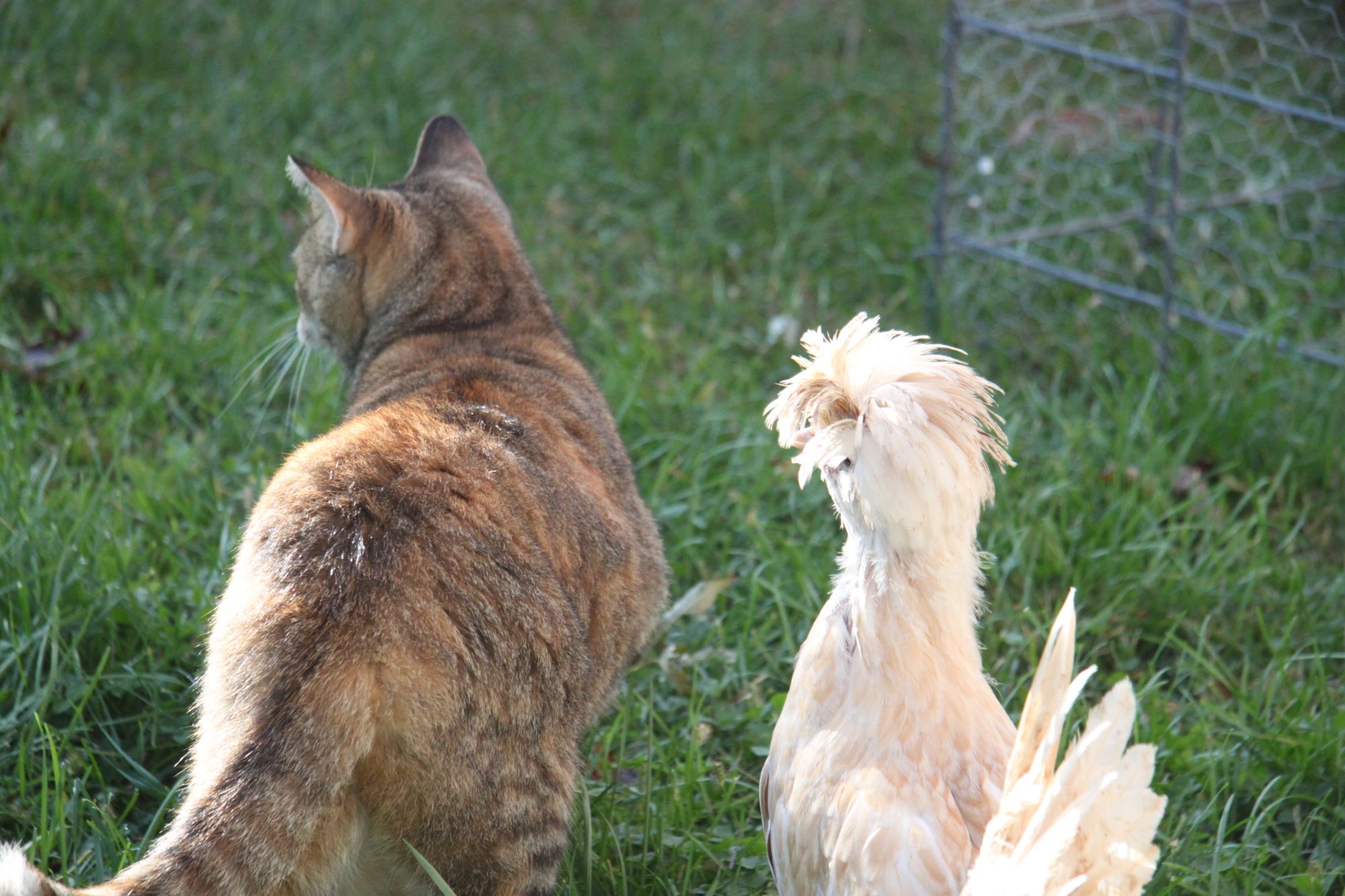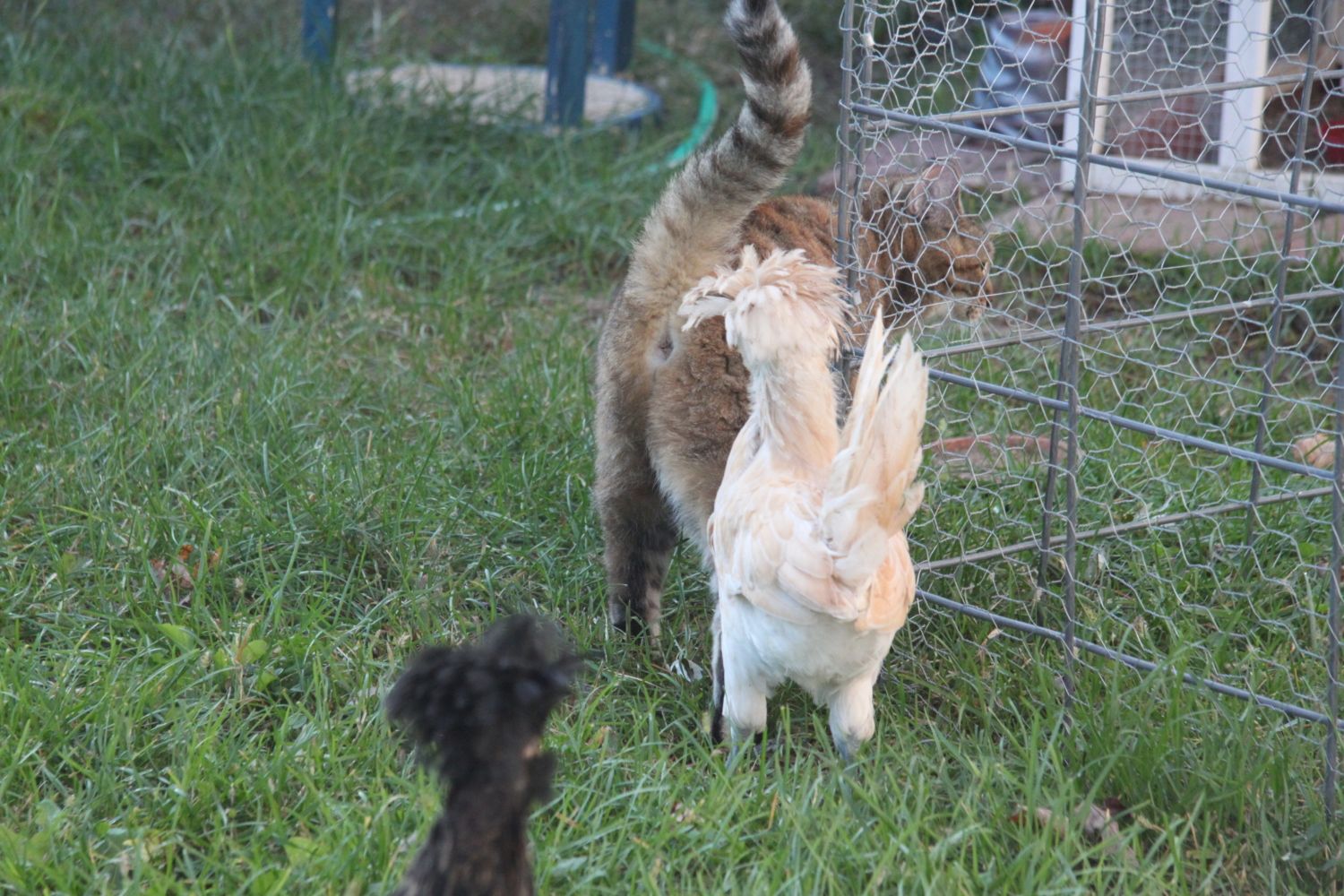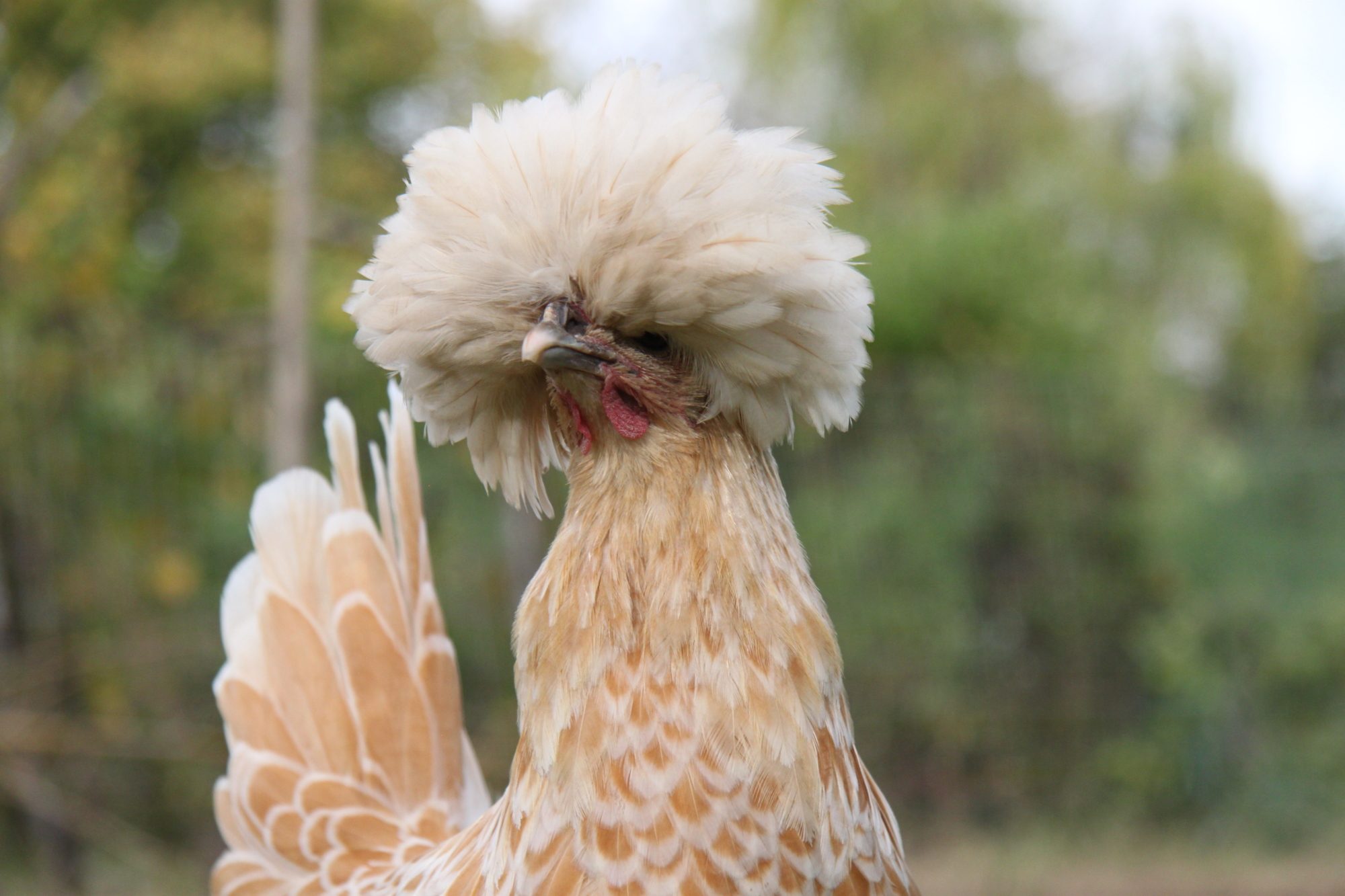 David Crowie is the friendliest of my Polish roosters. Practically a clone of the famous Chicky Gaga, except for being male, David is outgoing, brave, and eccentric. Like most Polish I've owned, he loves to chase cats, something my cat Athena was not happy about. Fortunately, neither one has any apparent interest in harming the other!